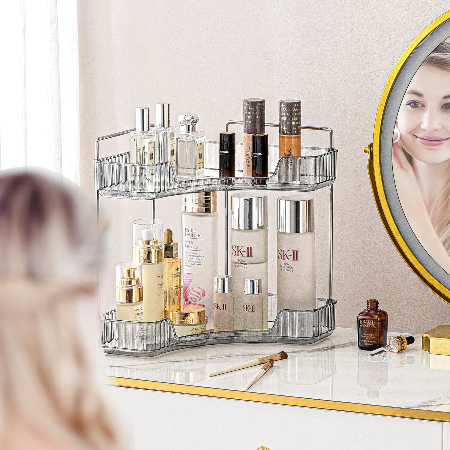 - LARGE CAPACITY 3 TIERS STORAGE: The cosmetics organiser has large 2 tiers storage space which are enough to meet your personal storage needs. It can hold your lipsticks, skincare products, hair cards, lotion, facial mask, mascara, eyeliner, eye shadow palette and other daily cosmetics, quickly find the cosmetics you need and keeps your vanity neat and organized