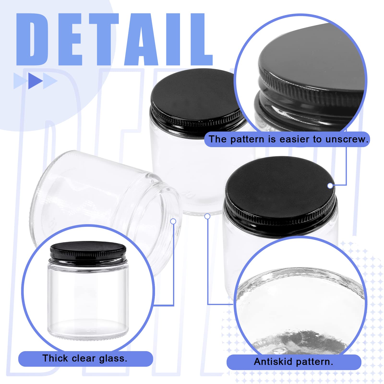 • ♛【High Quality Material】: These glass jars are made of high quality clear glass, stable and high temperature resistance. Black aluminum lids are not easy to rust. The airtight glass jars' thick glass raised bottom is effectively shockproof, and the screw of the bottle mouth is clear and easy to rotate.