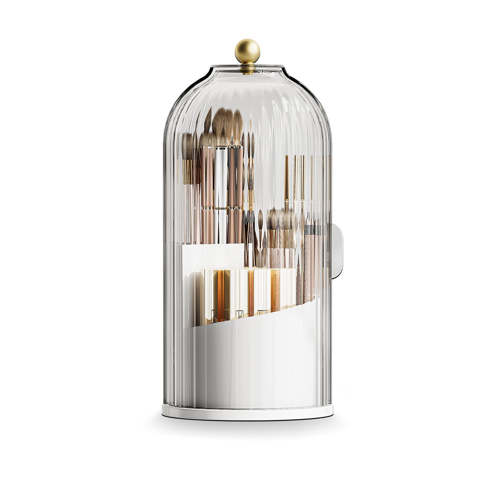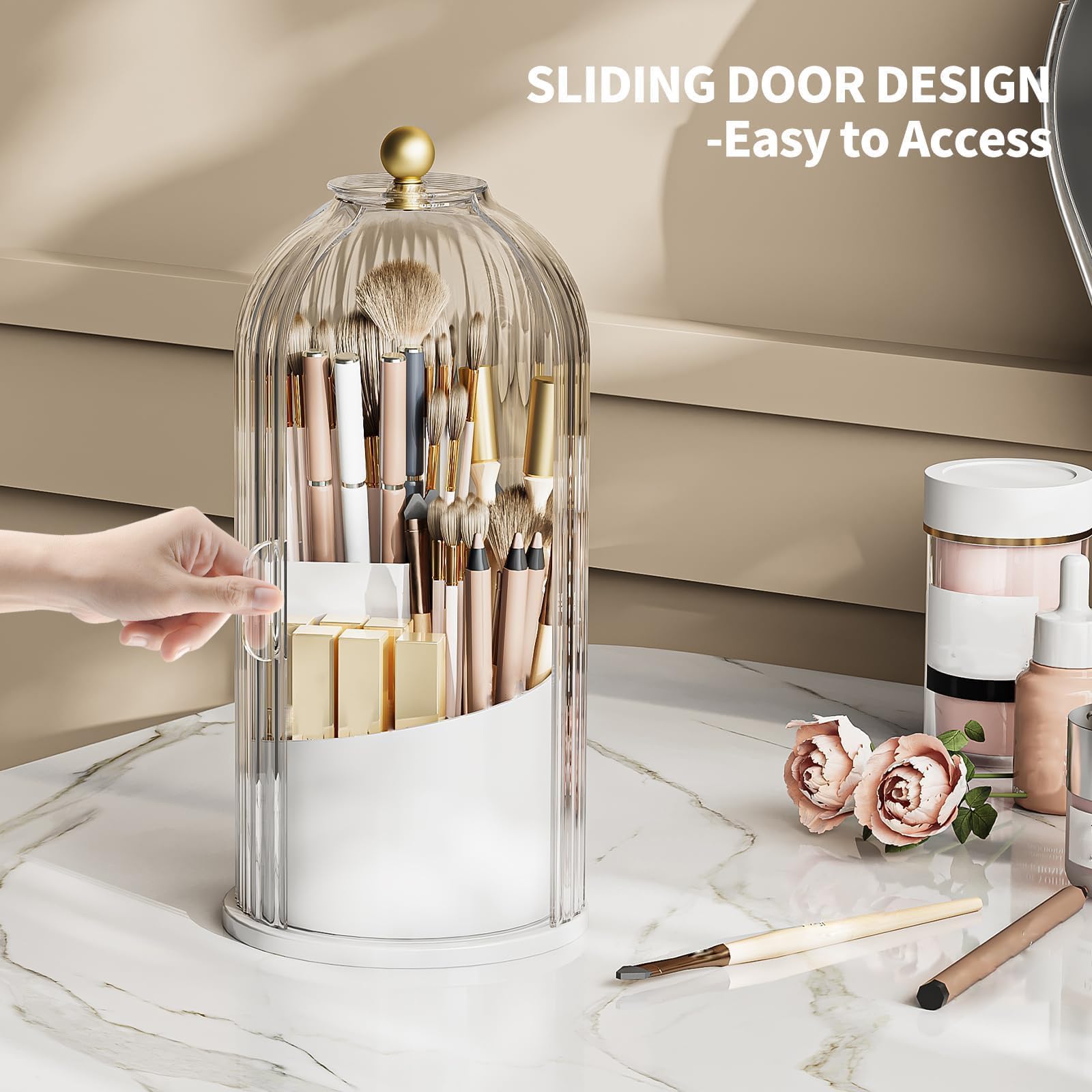 Makeup Brush Holder Rotating Organiser with Clear Lid,Sliding Opening Dustproof Makeup Brush Case Make up Organizer Storage for Dressing Table Organiser,Vanity,White Black