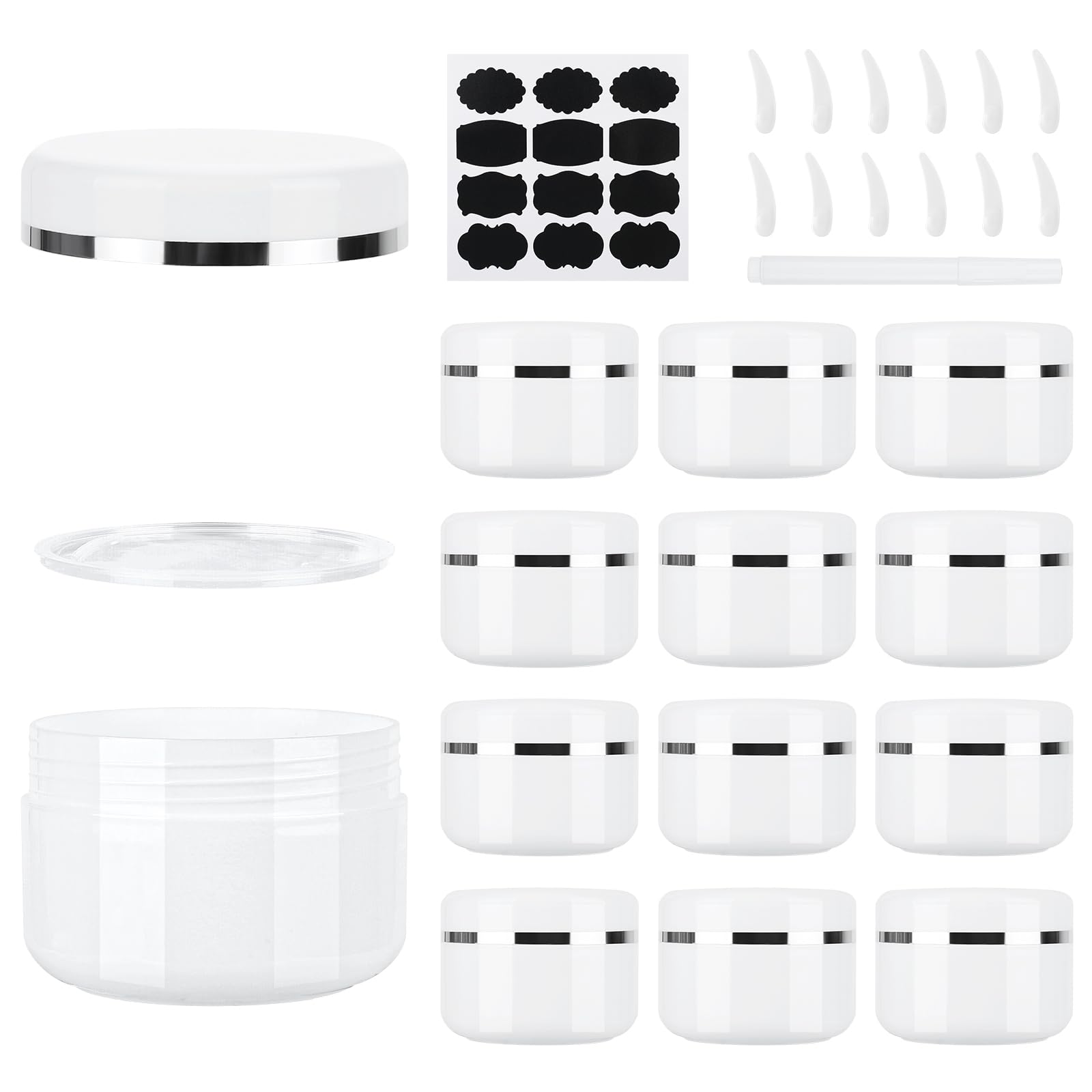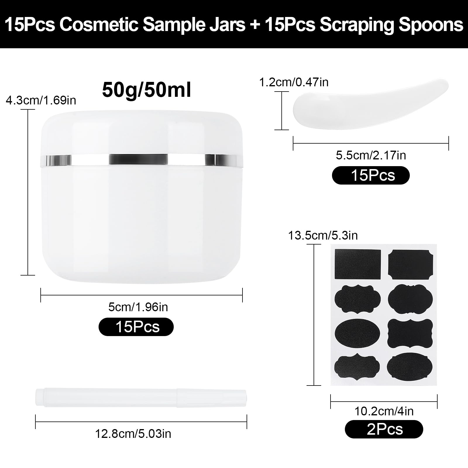 15 Pcs 50ml Cosmetic Sample Jars, Plastic Refillable Travel Pots, Cosmetic Pots with Lids, Travel Pots for Toiletries, with Spatulas, Labels and Pen for Makeup Beauty Nails