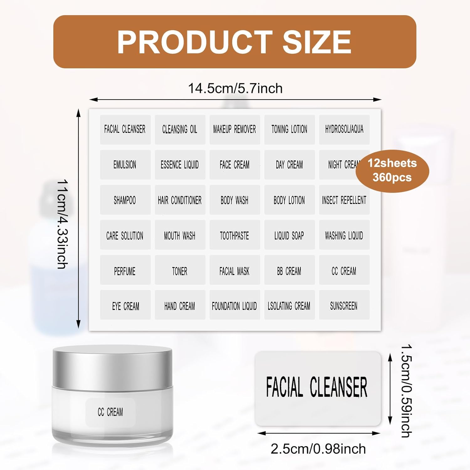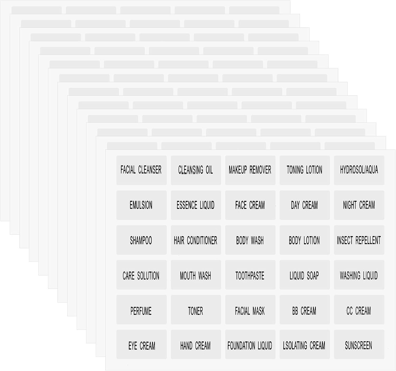 - 【Travel Toiletry Labels Set】You will receive 12 sheets of clear cosmetic labels, 360 sheets in total, each containing the names of 30 daily cosmetics and toiletries. Each label measures 0.98 inches x 0.6 inches. These bathroom labels can be used to classify bathroom supplies, toiletries, and skin care products, and are perfect for travel bottles, jars, and containers.