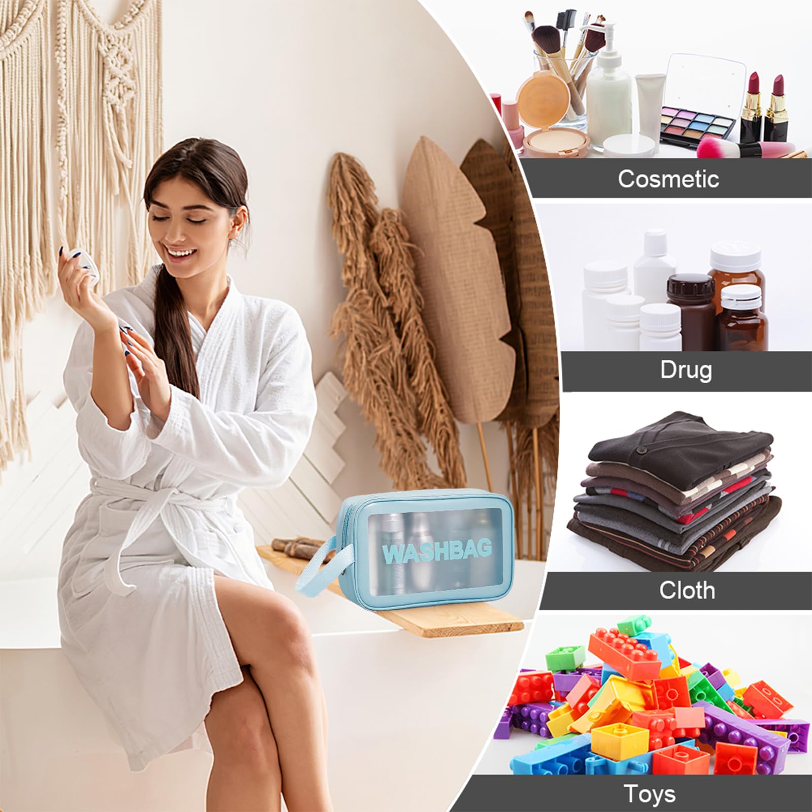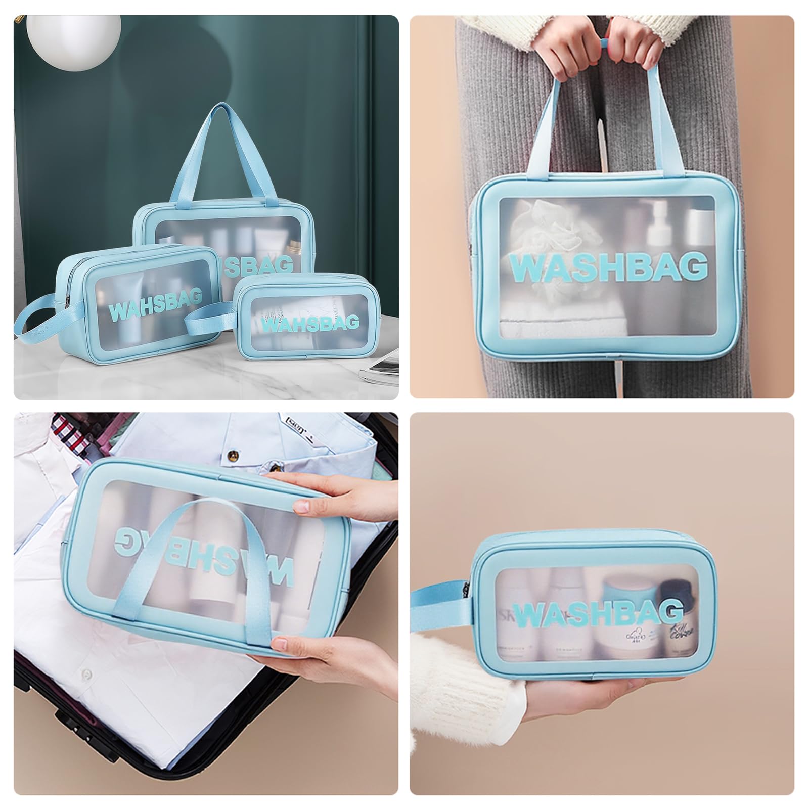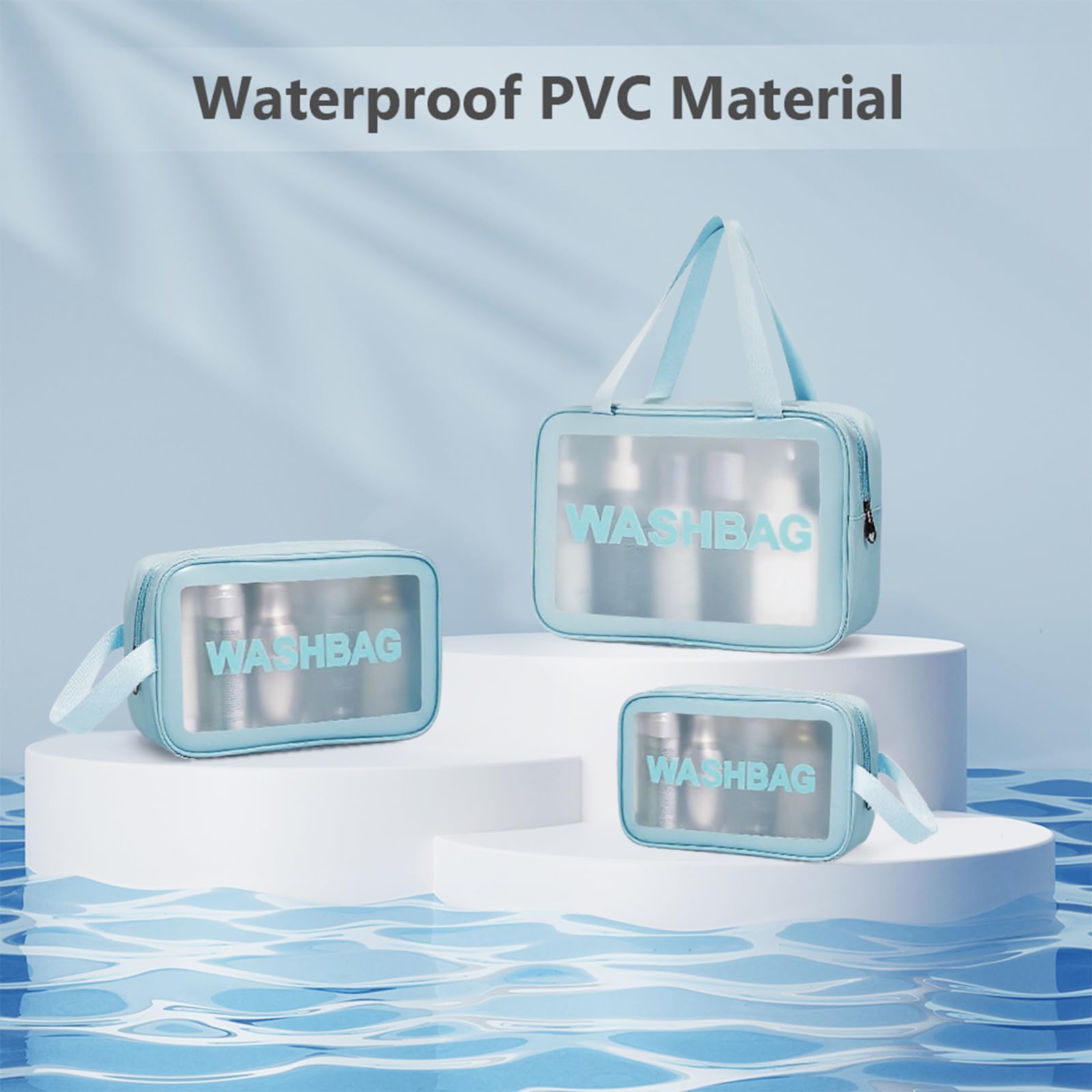 3PCS Clear Toiletry Bag, Wash Bag, Clear PU Makeup Bags, Waterproof Toiletry Travel Bags with Zipper Handle, Portable Airport Cosmetic B-ag for Travel Bathroom Men Women(Blue)