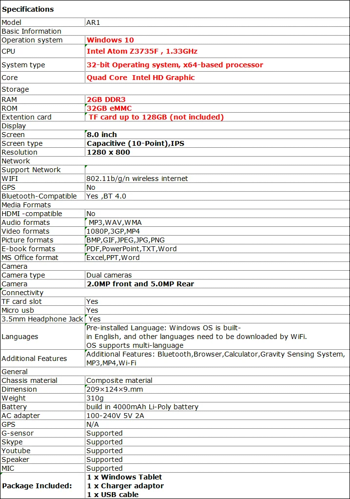 8 INCH AR3 Windows 10 Tablet PC Z8350 CPU 8GB RAM 128GB ROM 1280*800 Pixel build in 4000mAh Battery Dual Camera Quad Core WIFI