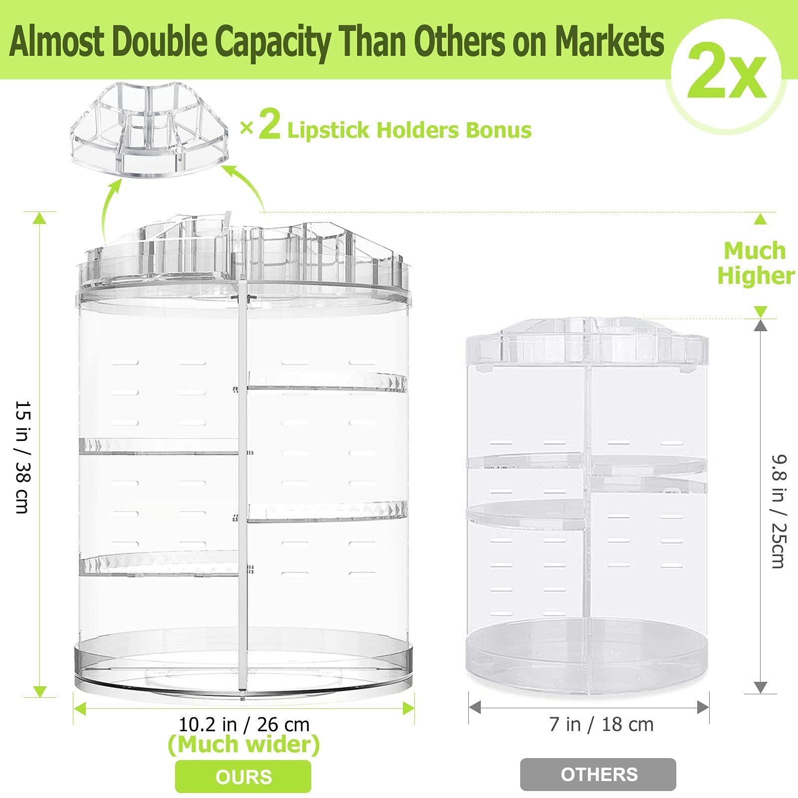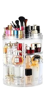 - [MULTIPLE COMPARTMENTS]---Measures 38 cm (15 in) in height and 26 cm (10.3 in) in diameter (base) when assembled; accommodates all of your jewelry, cosmetics, makeup brushes, skincare products, lipsticks, nail polish, eyeliner and more in extra large containers, saves you counter space and keep your countertop, dresser and vanity tidy.
