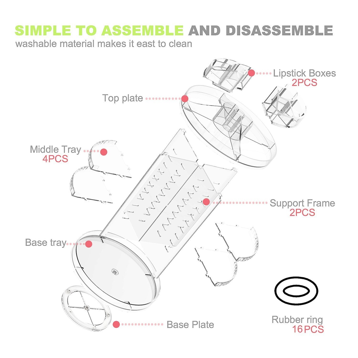 - 1 × 360 Makeup Organizer (Including 1 base plate, 2 support plates, 4 trays, 1 top plate )