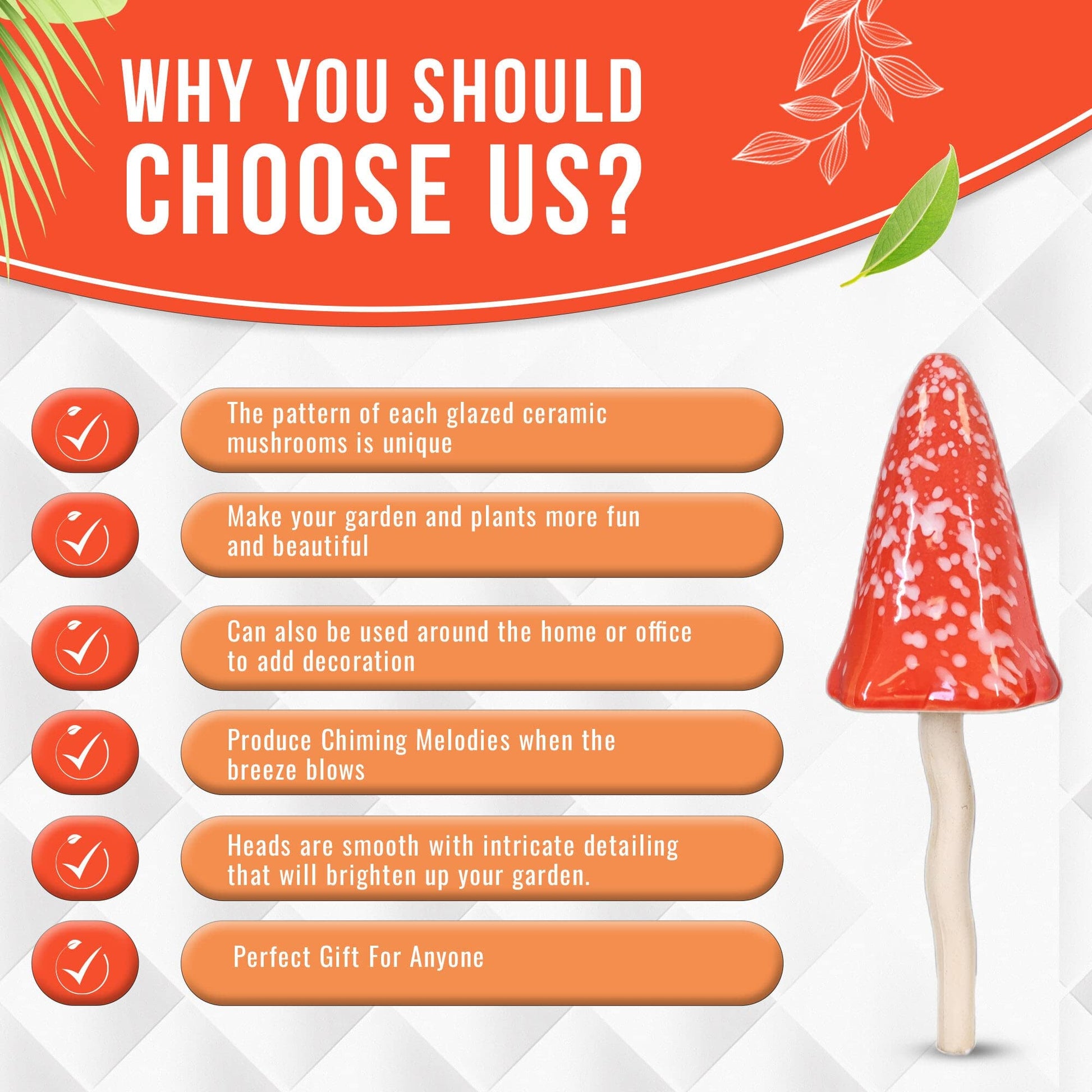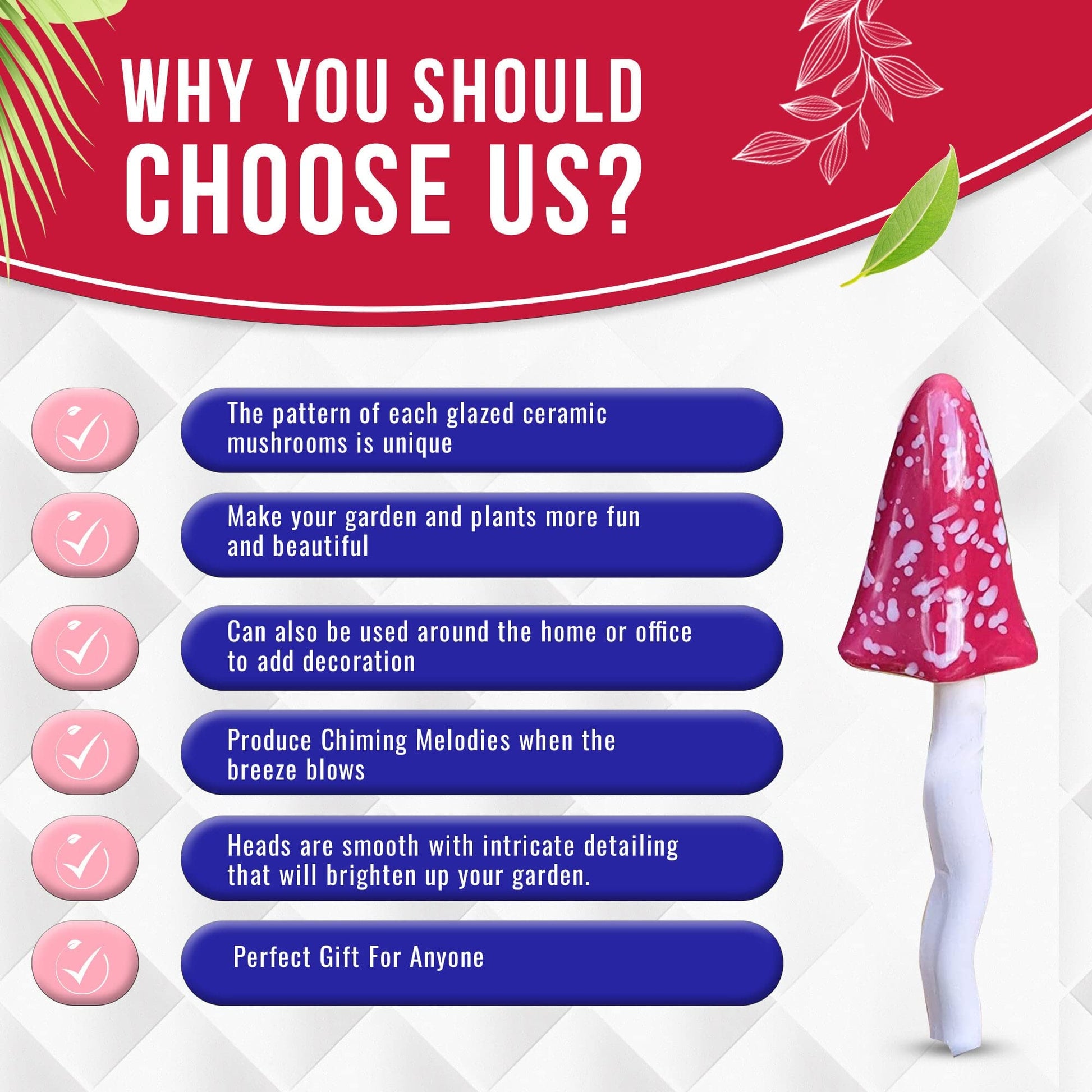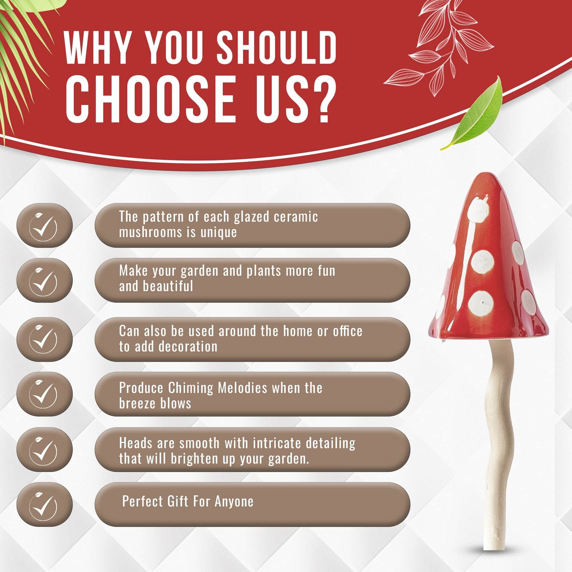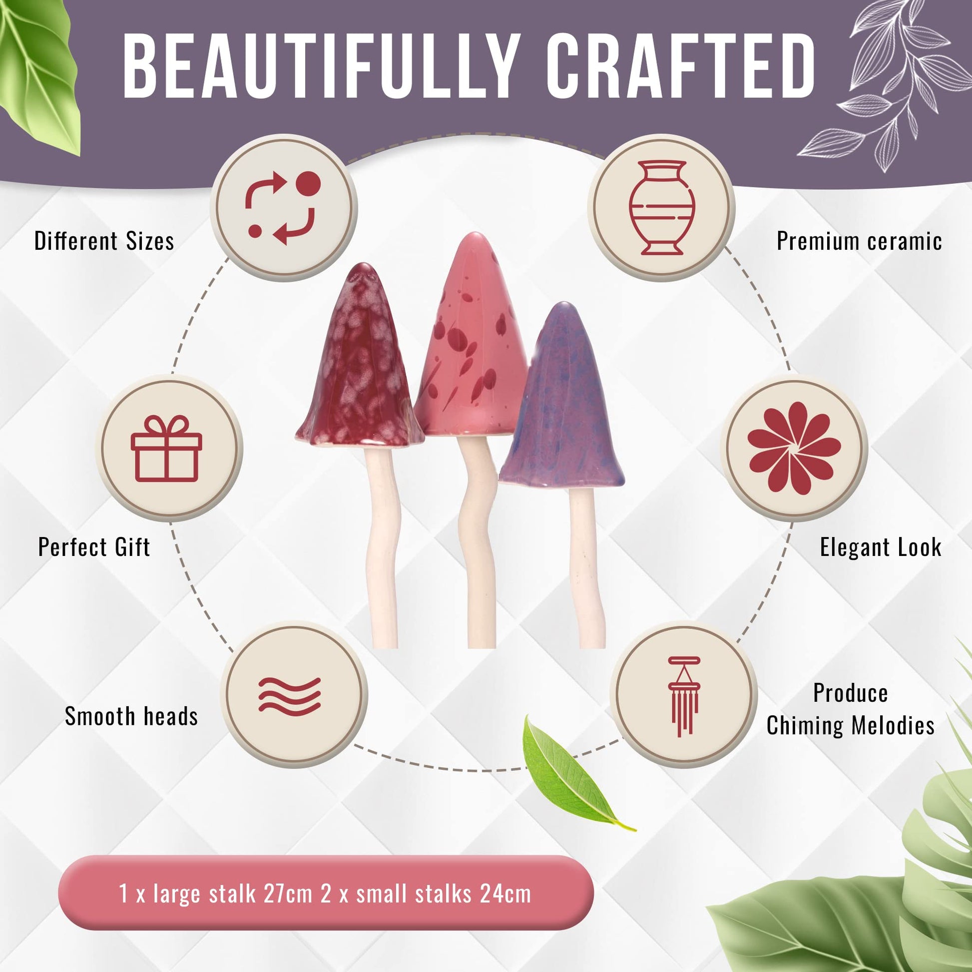 - Each ceramic toadstool is handcrafted and hand-glazed with distinctive patterns to bring a magical touch to your garden. Easy to insert into the soil, they make your plants and plant pots more delightful and add a tinkling melody as they sway gently in the breeze.