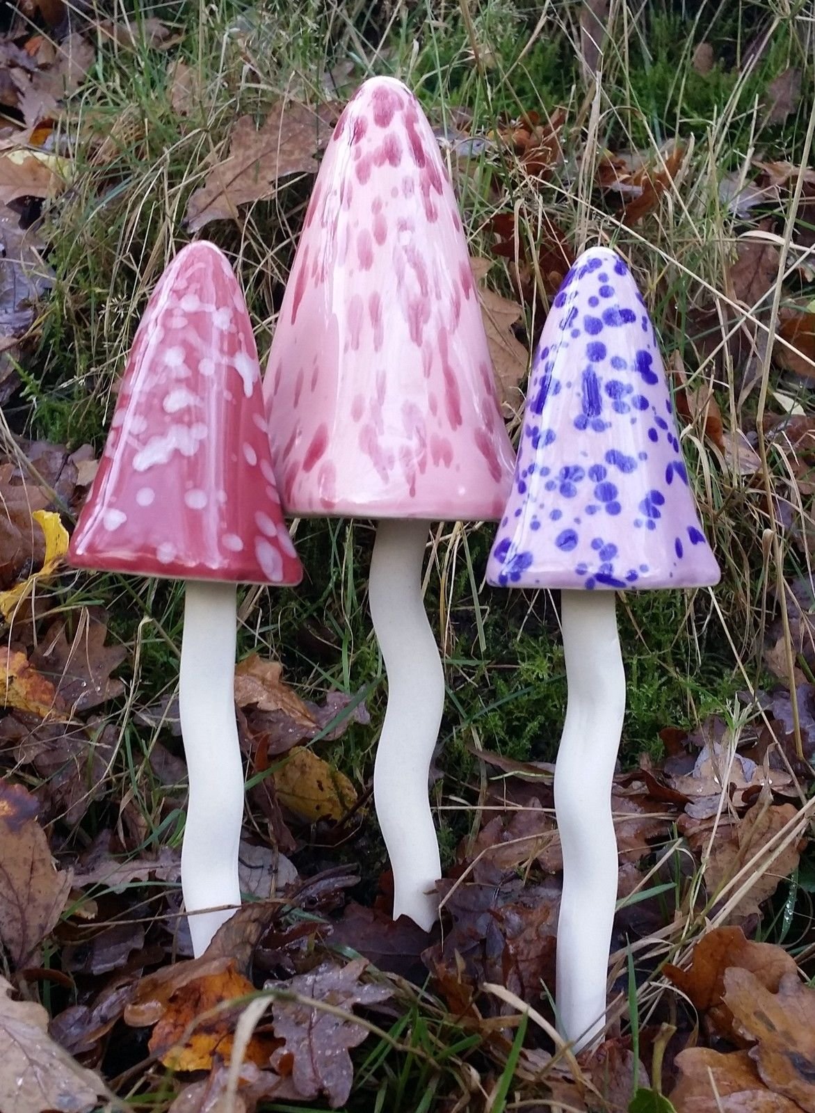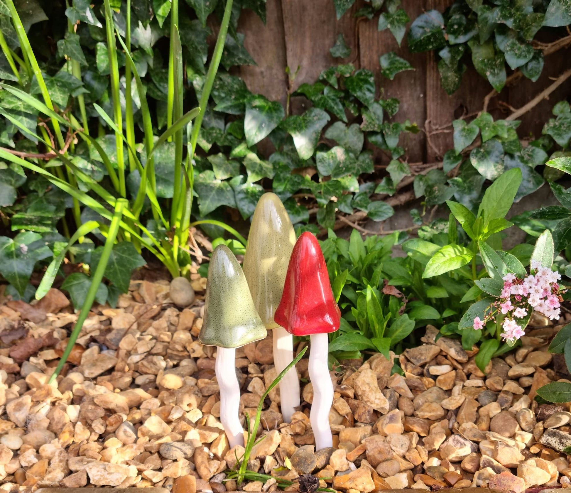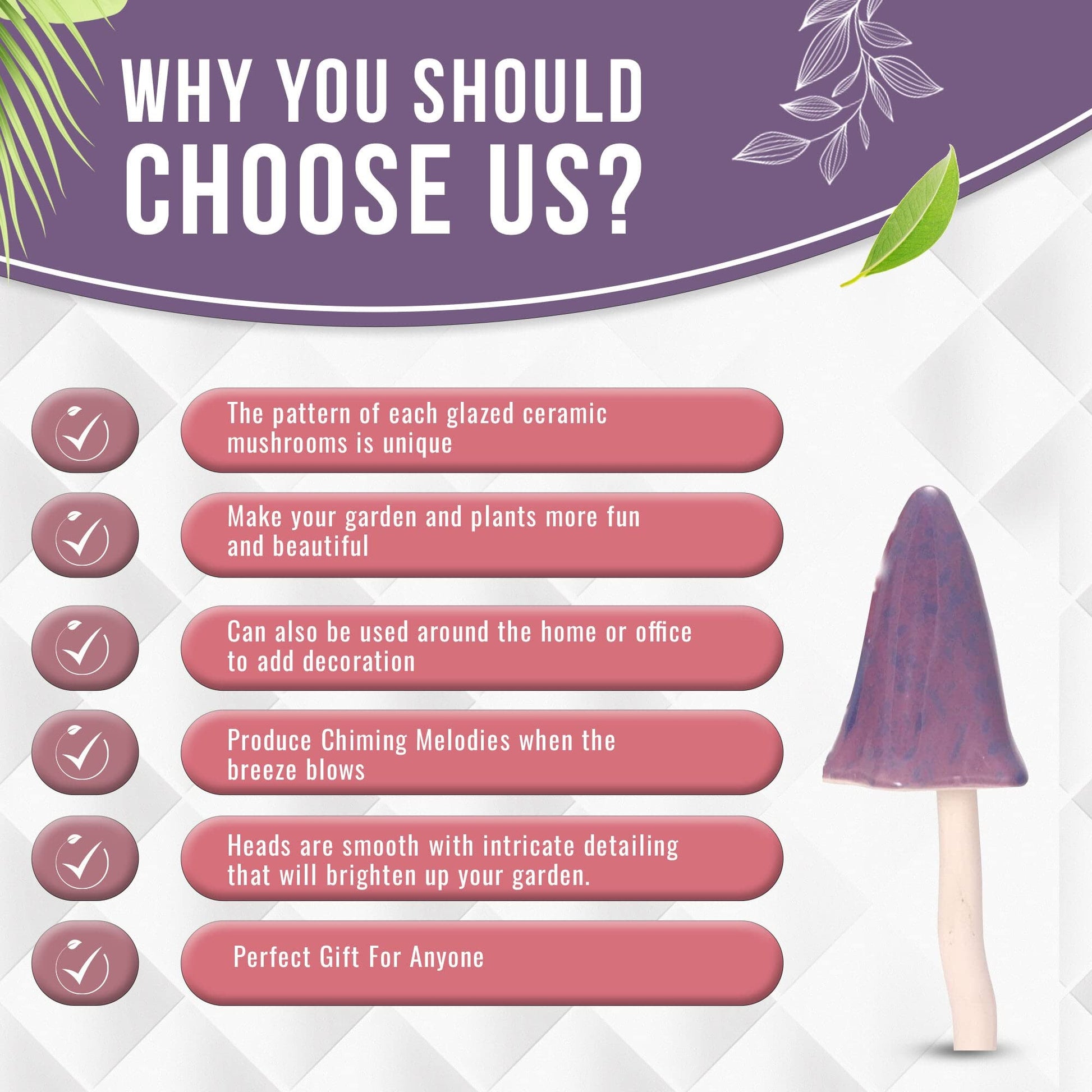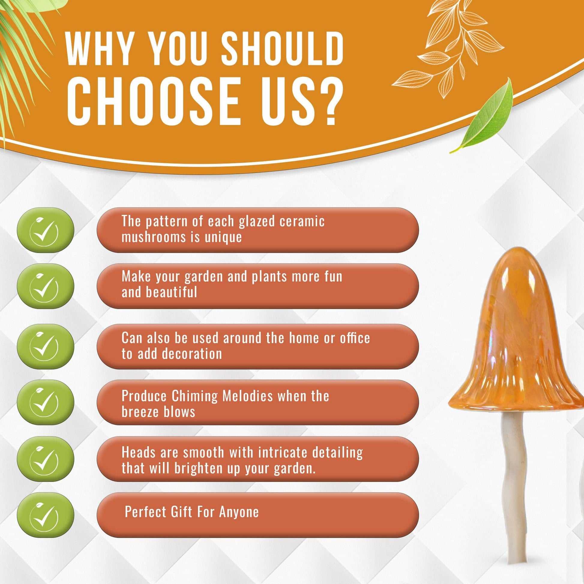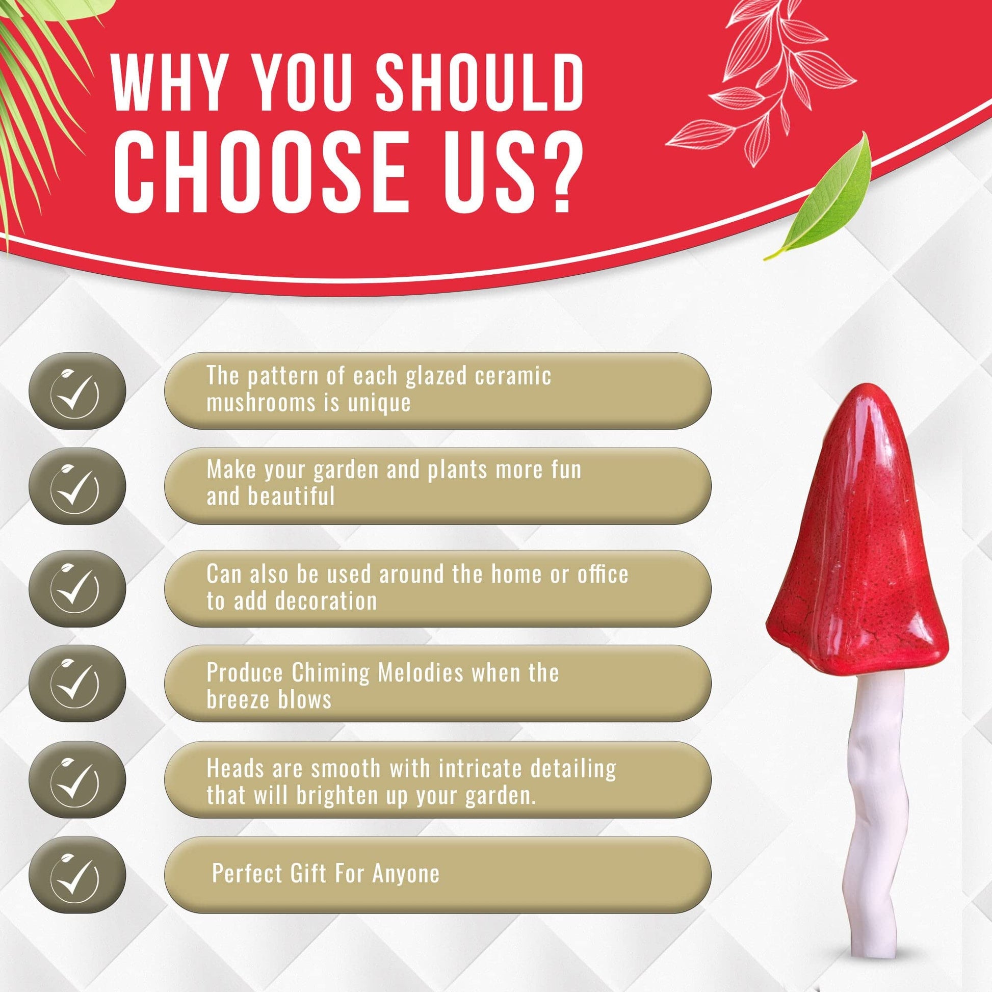 - Each ceramic toadstool is handcrafted and hand-glazed with distinctive patterns to bring a magical touch to your garden. Easy to insert into the soil, they make your plants and plant pots more delightful and add a tinkling melody as they sway gently in the breeze.