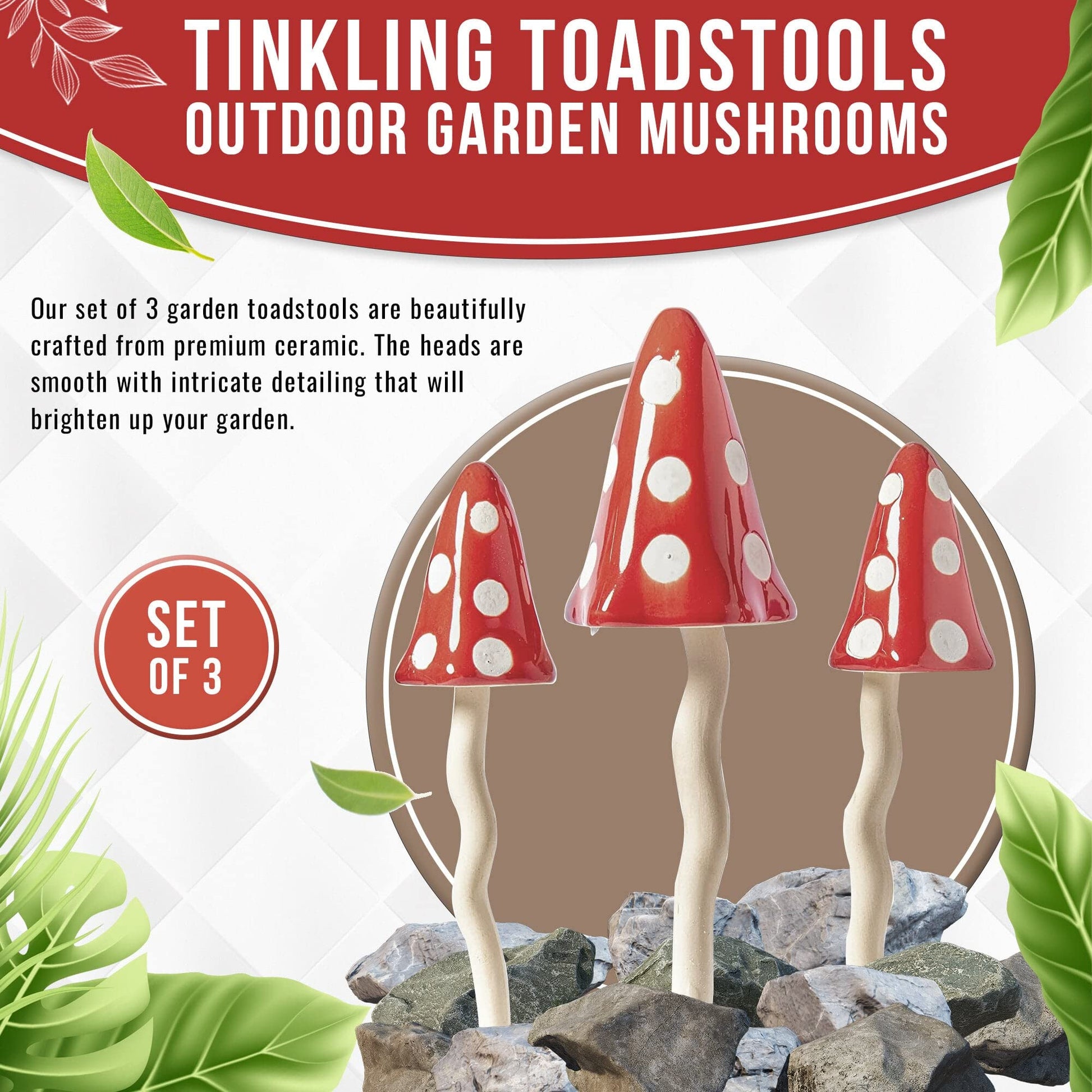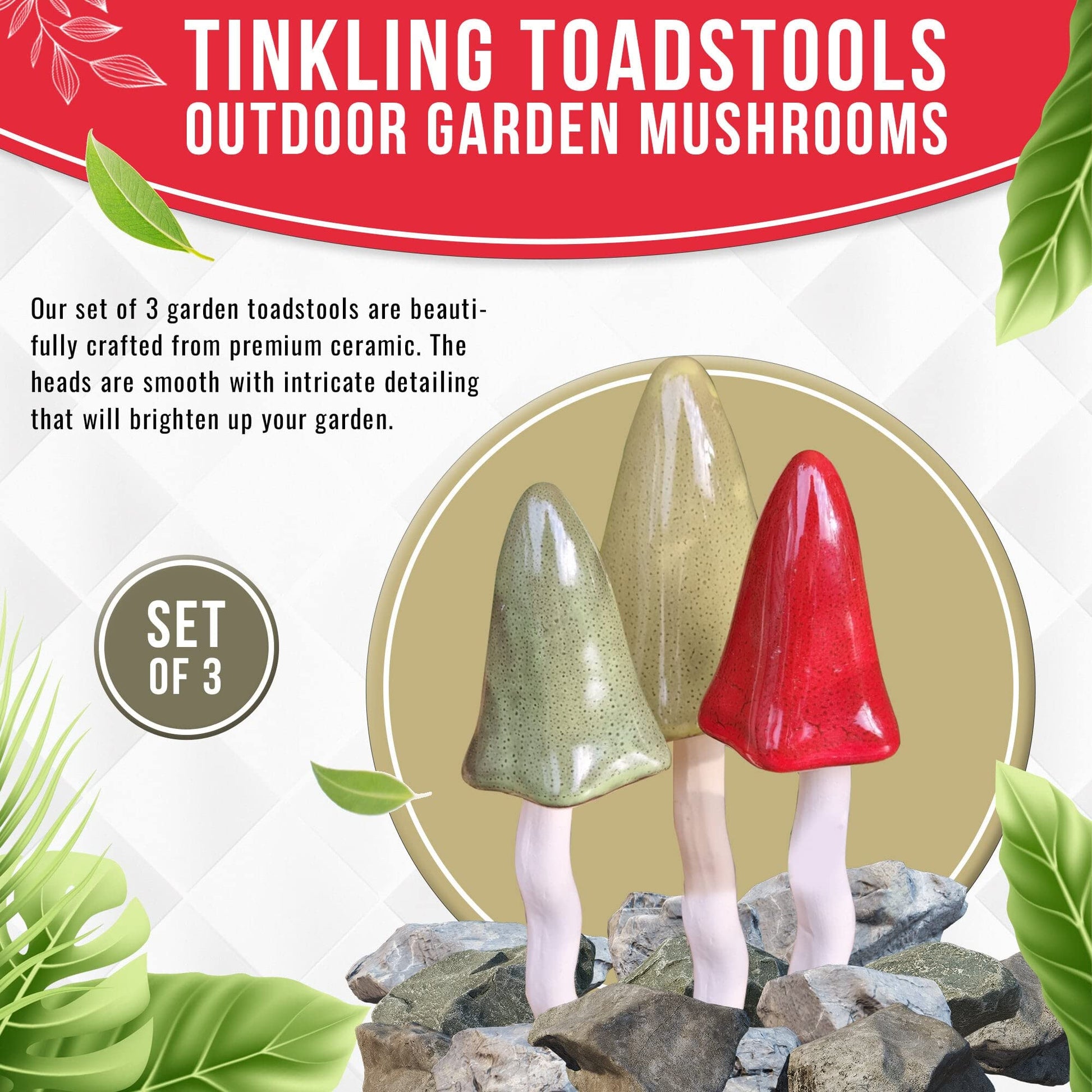- Delight your family and guests with HH Home Hut's charming set of 3 tinkling toadstools. These enchanting ceramic garden ornaments are designed to add a touch of whimsical and a pleasant tinkling sound to your outdoor space, creating a magical atmosphere that's perfect for both day and night.