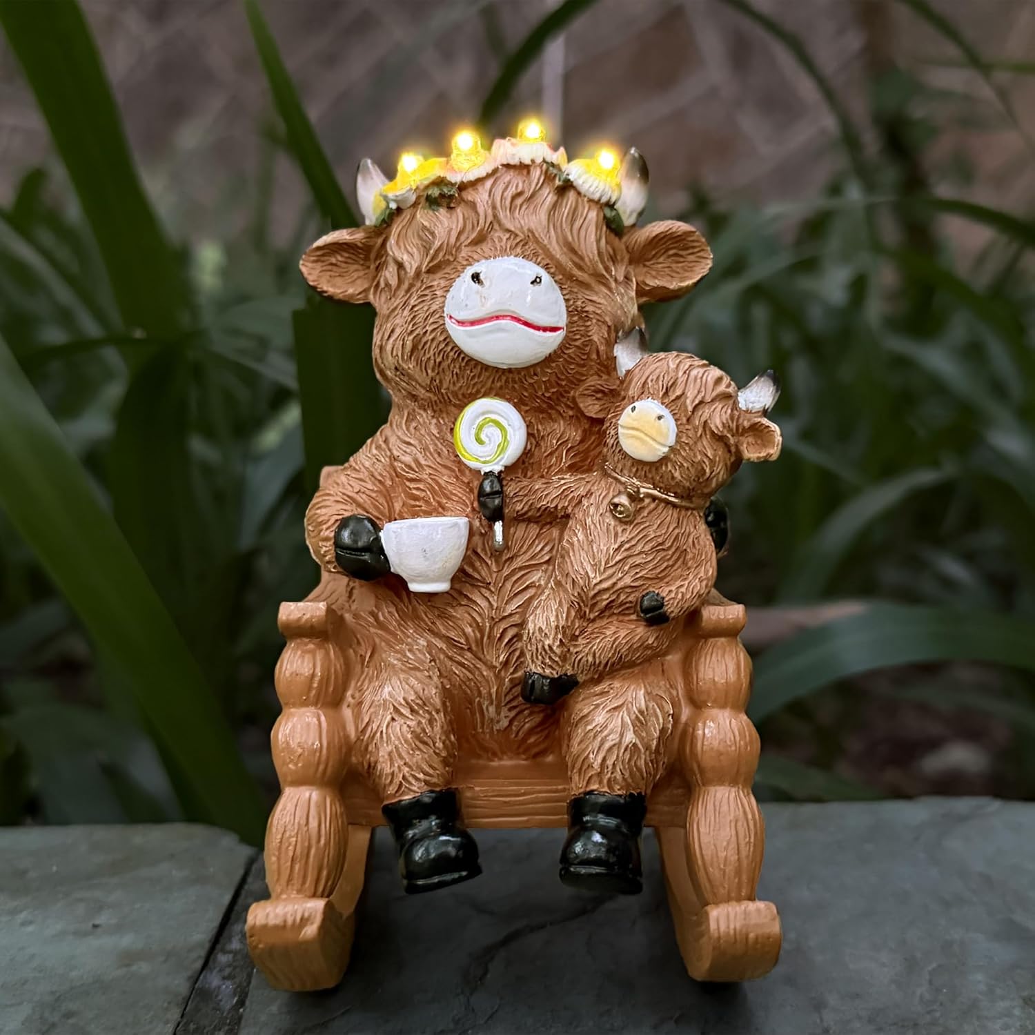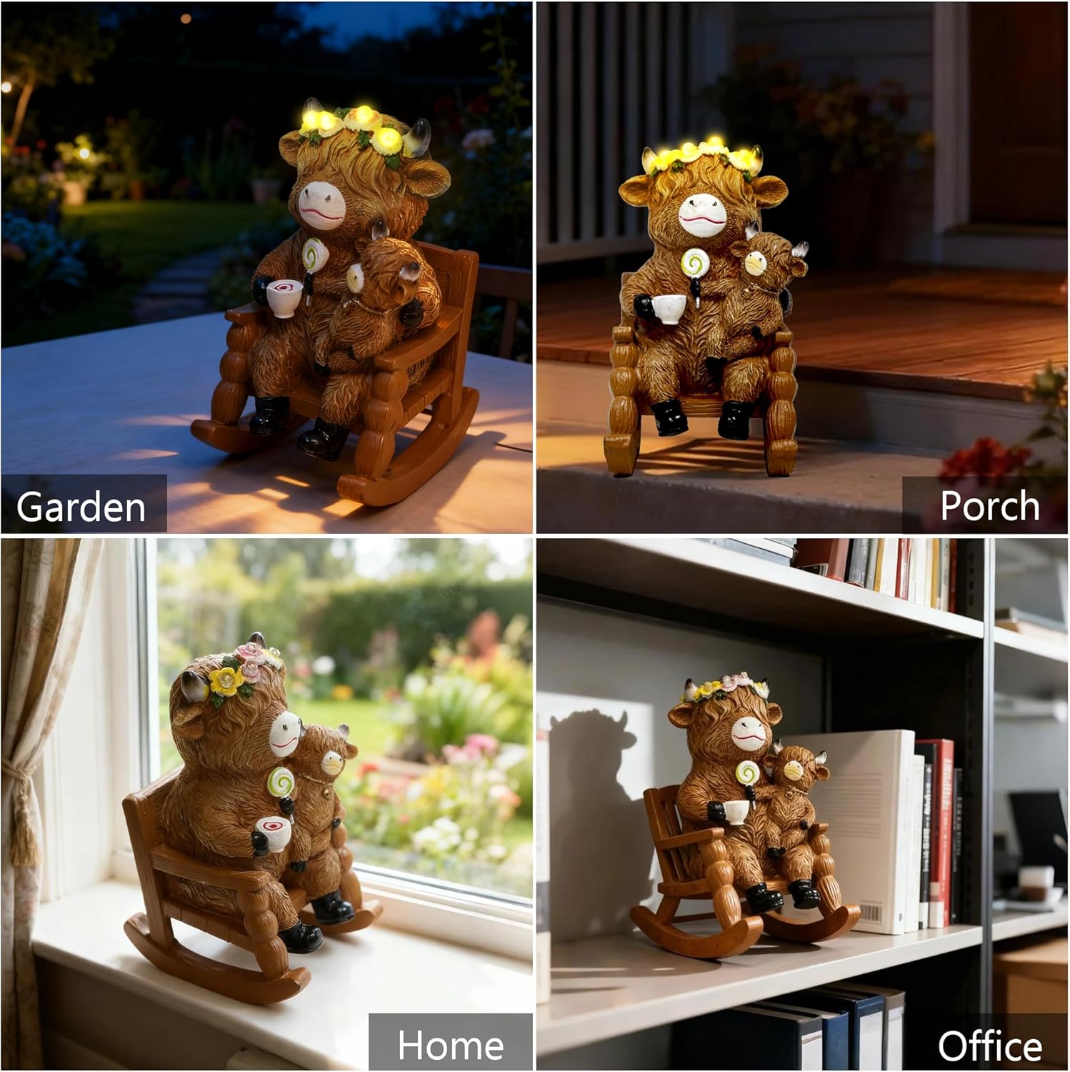 Highland Cow Garden Ornaments Outdoor- Solar Highland Cow Ornaments Statues Mother and Child on Rocking Chair, Garden Decor with Luminous Flowers for Yard, Lawn, Patio, Home, Birthday Gifts for Women