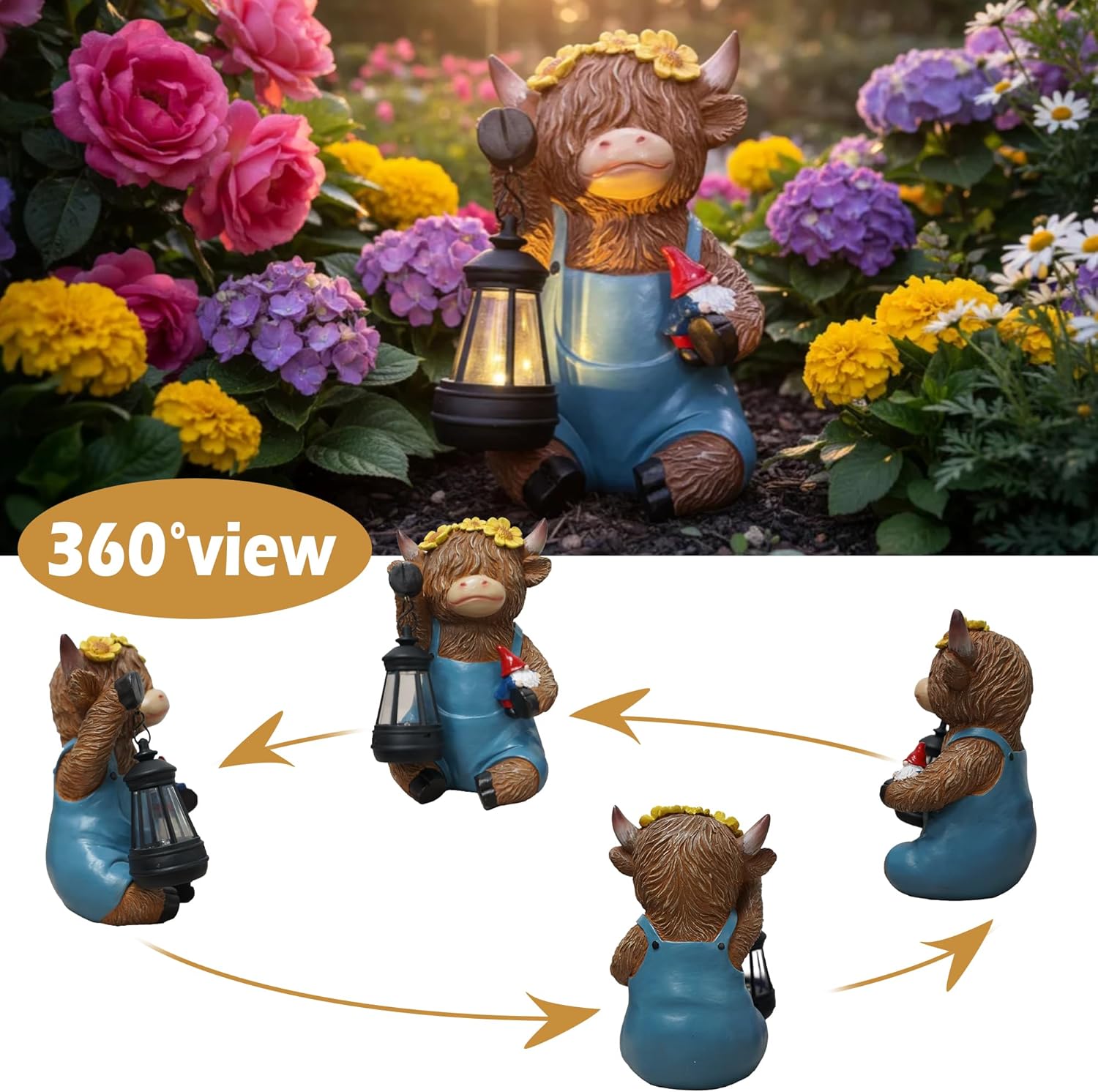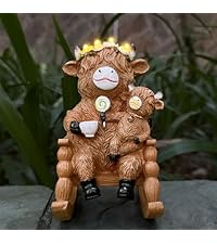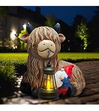 - Exquisite Design: The Highland Cow Statues feature an adorable design, with its left hand holding a gnome, right hand carrying a lantern, wearing a pair of blue pants, and several sunflowers adorning its head. Combined with its brown appearance, it's incredibly charming. Especially at night, when the LED lights illuminate, the garden statues gains even more character and beauty.