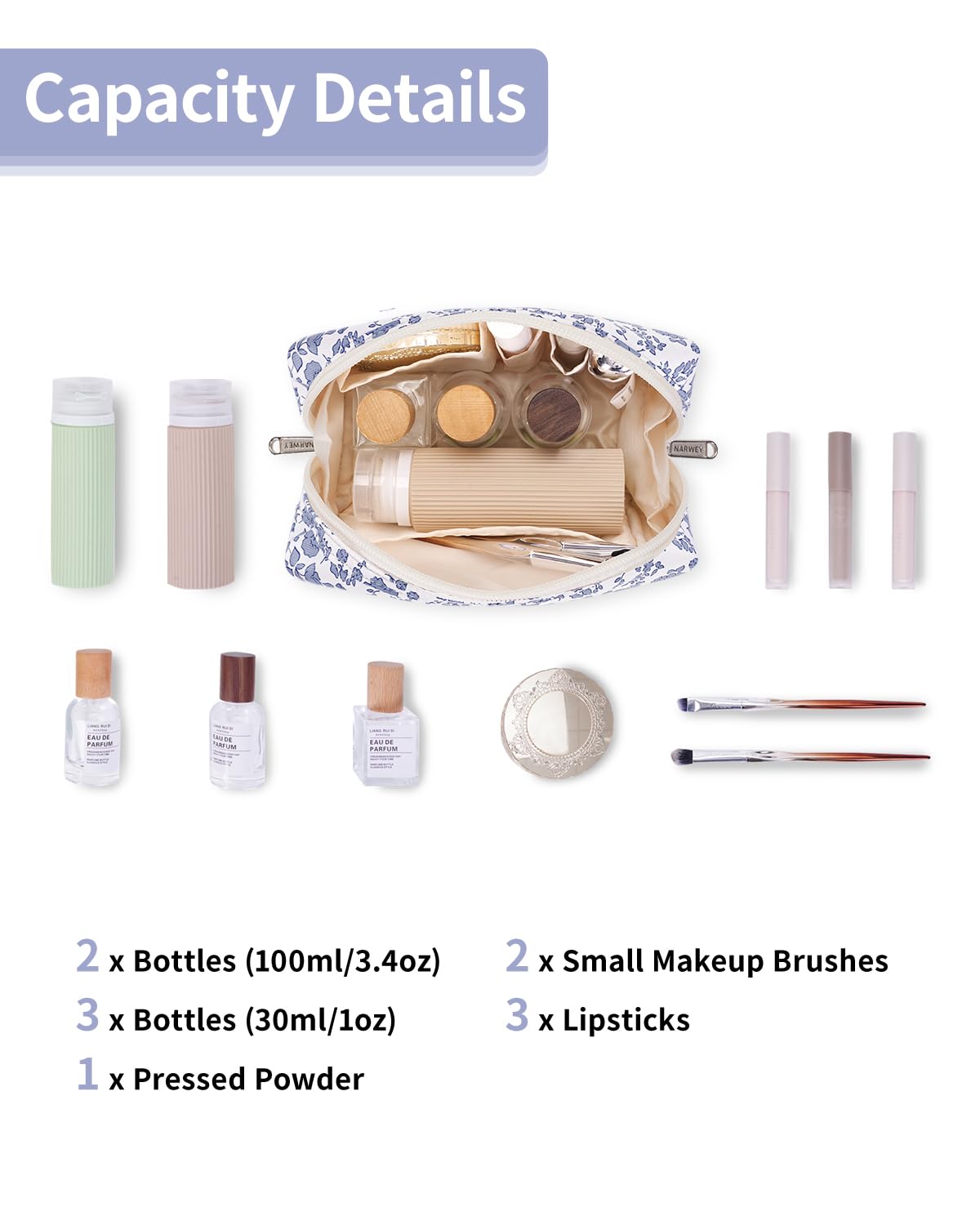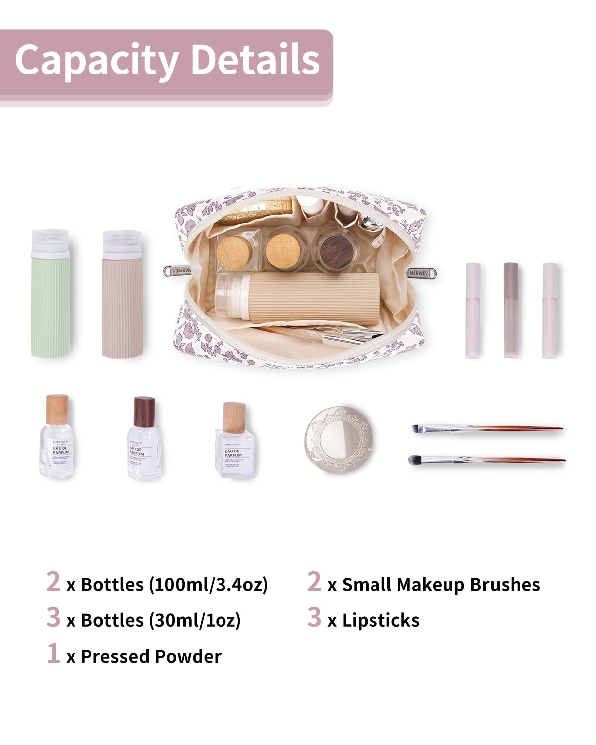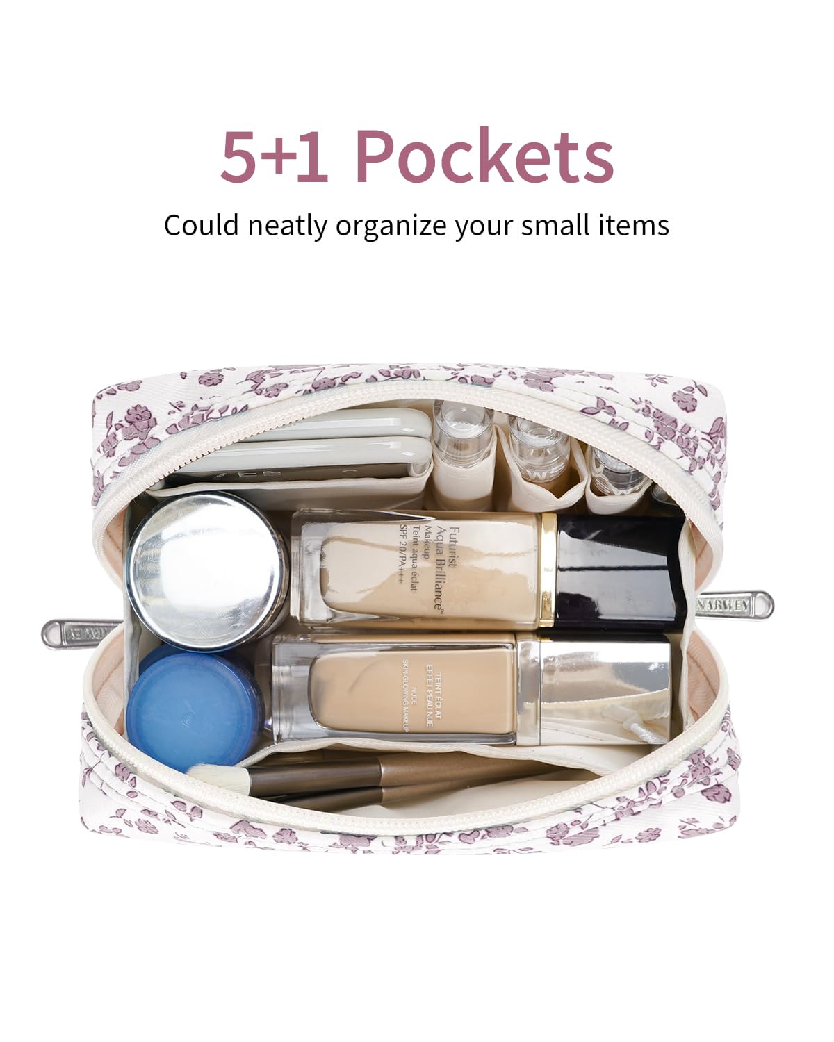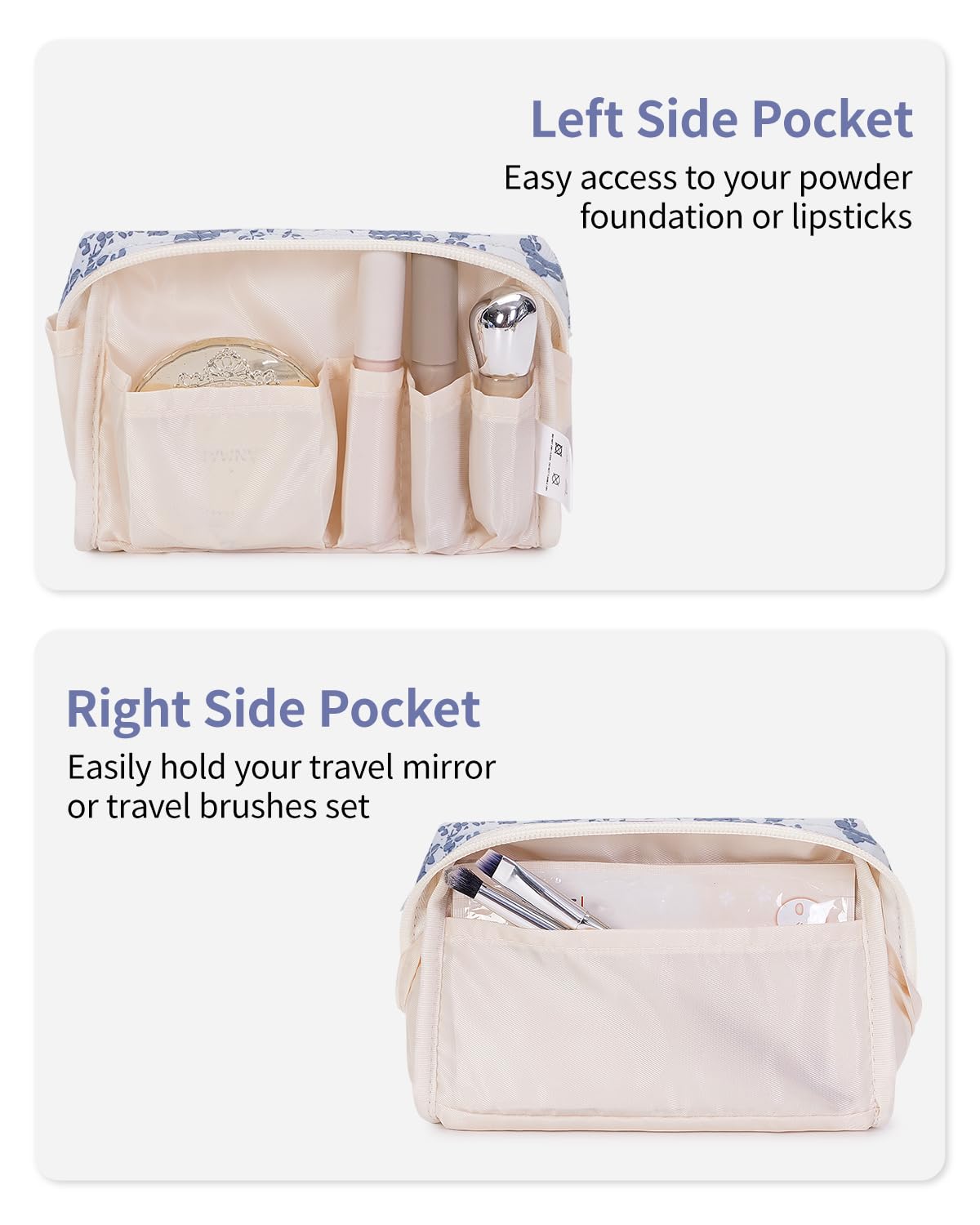 - WELL-ORGANIZED COMPARTMENTS. Practical main compartment with 5 inner small pockets could neatly organize your makeup. Main compartment could easily hold travel-size toiletries or skin-care products. It could fit 3 brushes, eyeliners, foundation, concealer, lipsticks, blushes, powder, eyeshadow pallet, mascara, lash curler, sponges, sunscreen, 0.08kg lotion, cream, facial cleanser and toothpaste