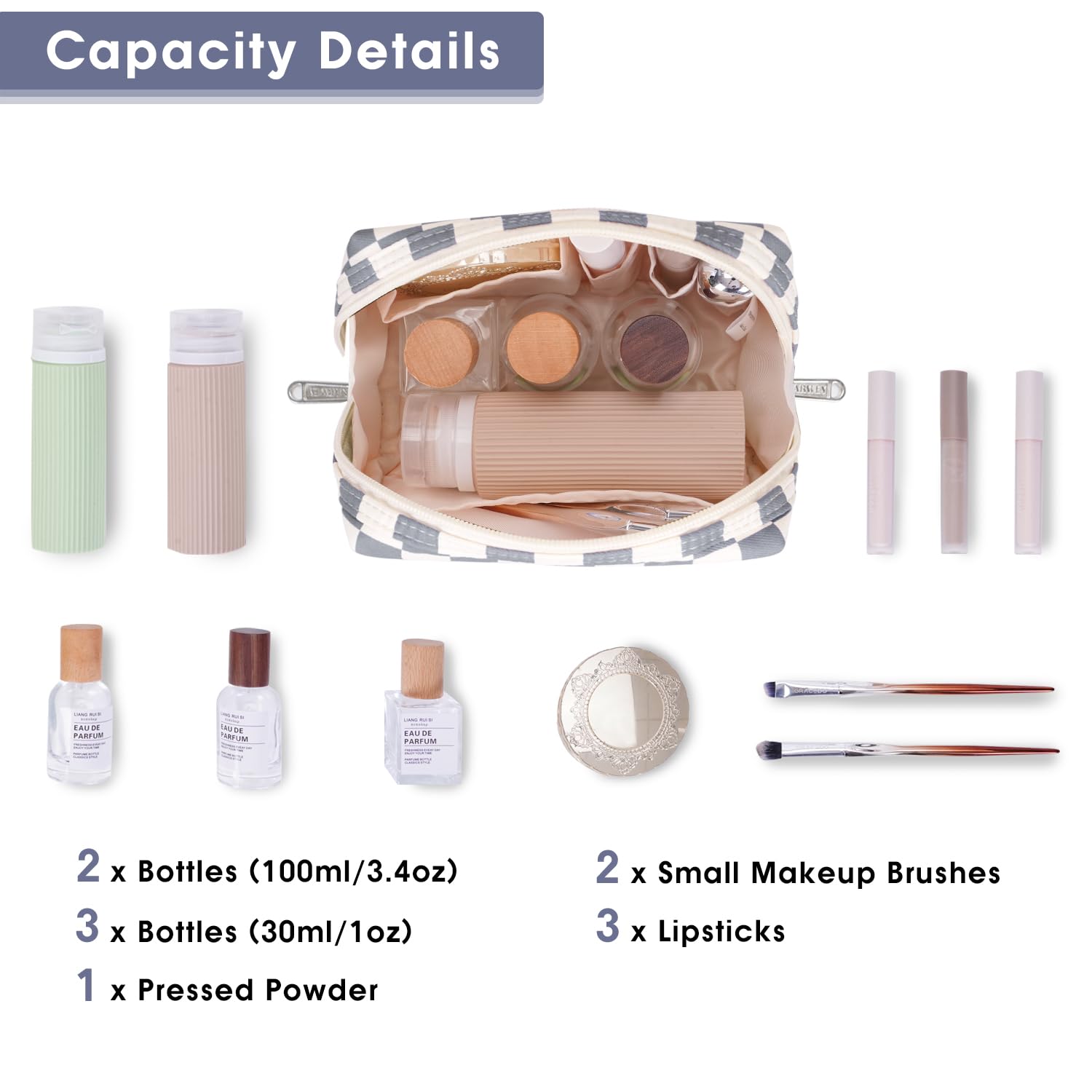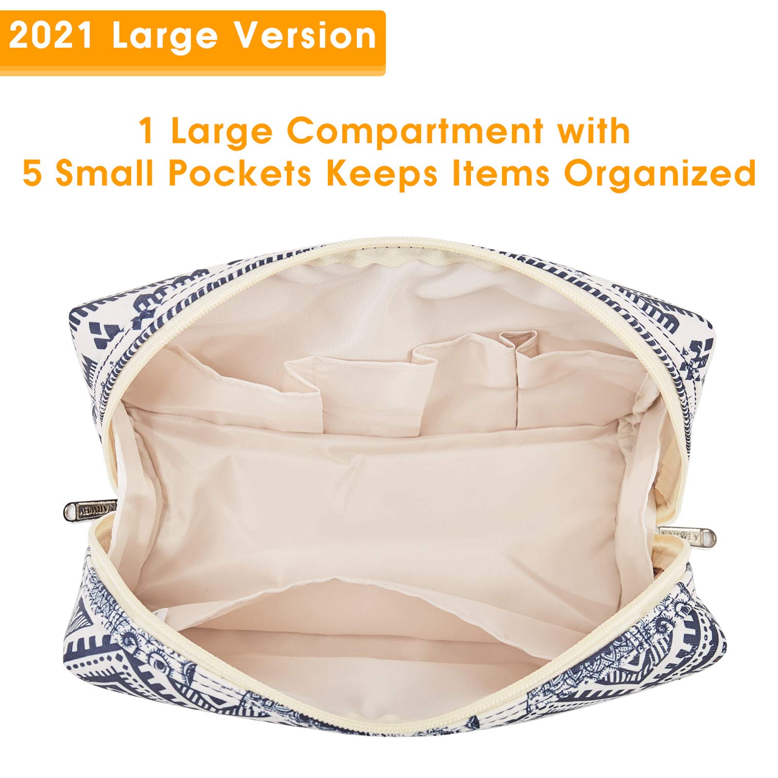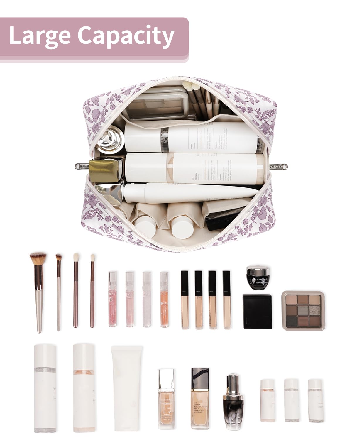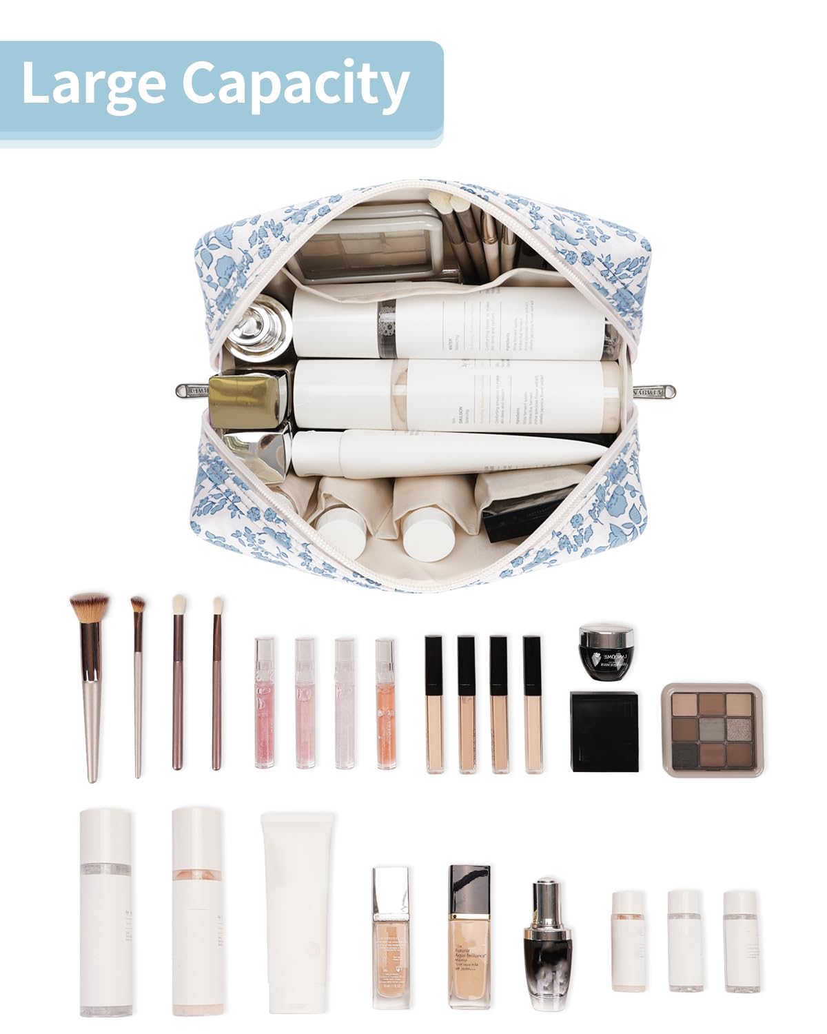 - WELL-ORGANIZED COMPARTMENTS. Practical main compartment with 5 inner small pockets could neatly organize your makeup. Main compartment could easily hold travel-size toiletries or skin-care products. It could fit 3 brushes, eyeliners, foundation, concealer, lipsticks, blushes, powder, eyeshadow pallet, mascara, lash curler, sponges, sunscreen, 0.08kg lotion, cream, facial cleanser and toothpaste