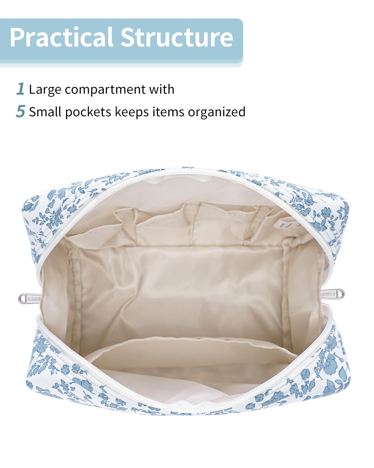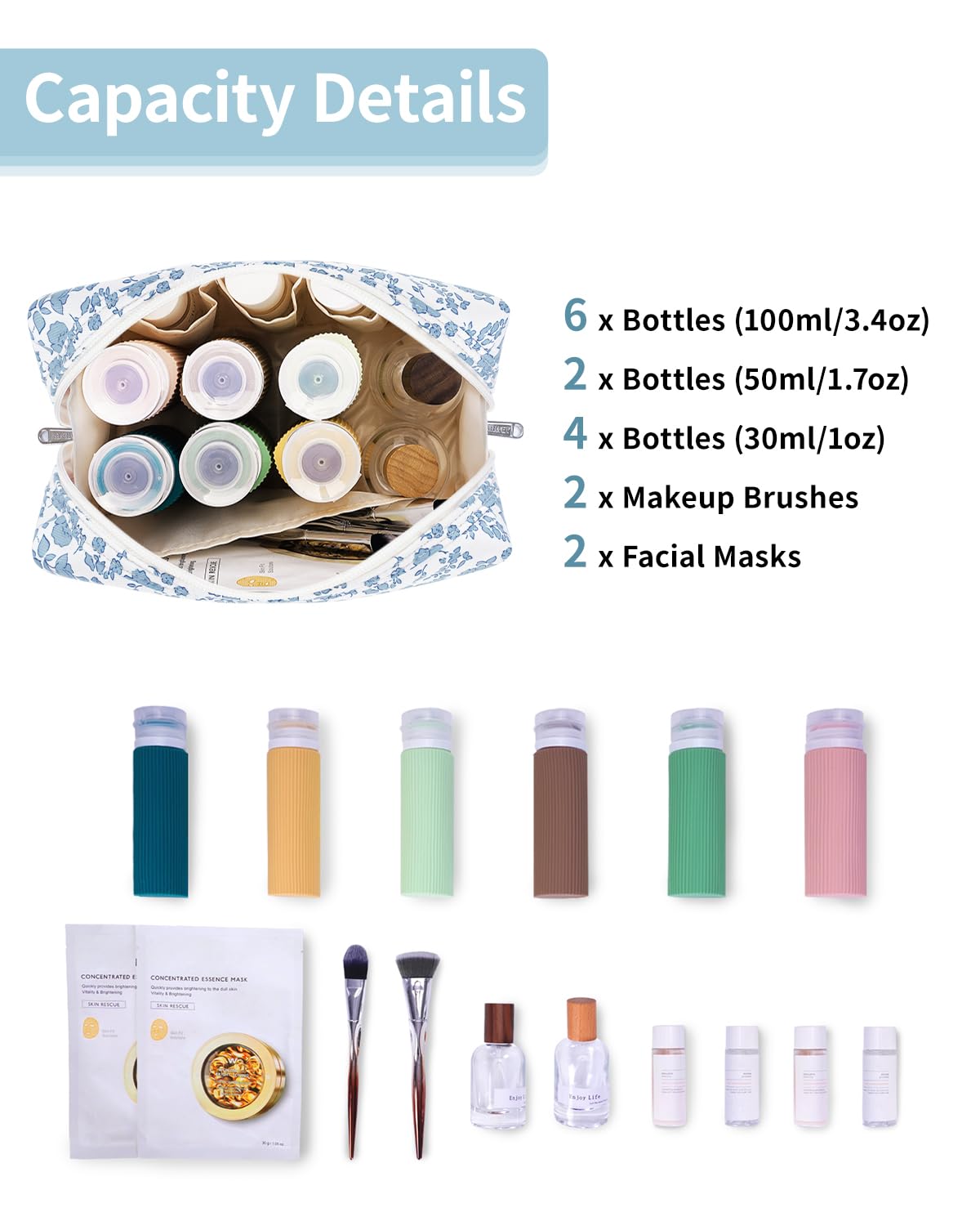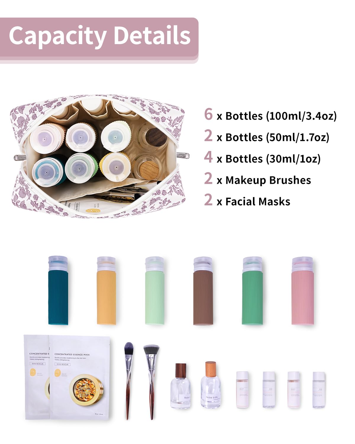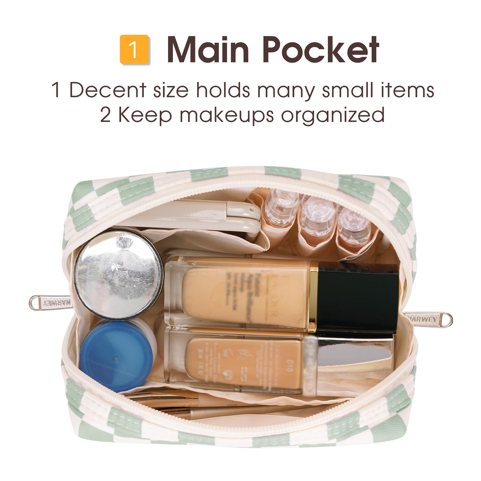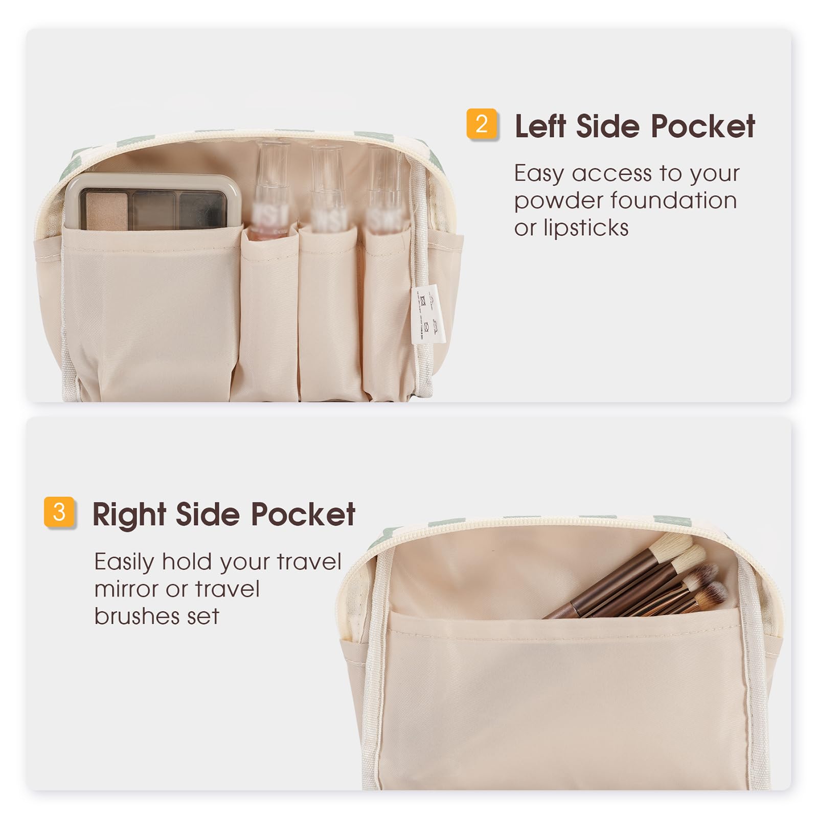 - WELL-ORGANIZED COMPARTMENTS. Practical main compartment with 5 inner small pockets could neatly organize your makeup. Main compartment could easily hold travel-size toiletries or skin-care products. It could fit 3 brushes, eyeliners, foundation, concealer, lipsticks, blushes, powder, eyeshadow pallet, mascara, lash curler, sponges, sunscreen, 0.08kg lotion, cream, facial cleanser and toothpaste