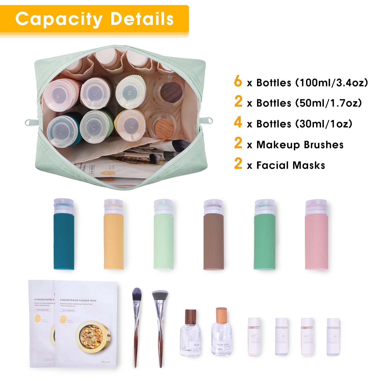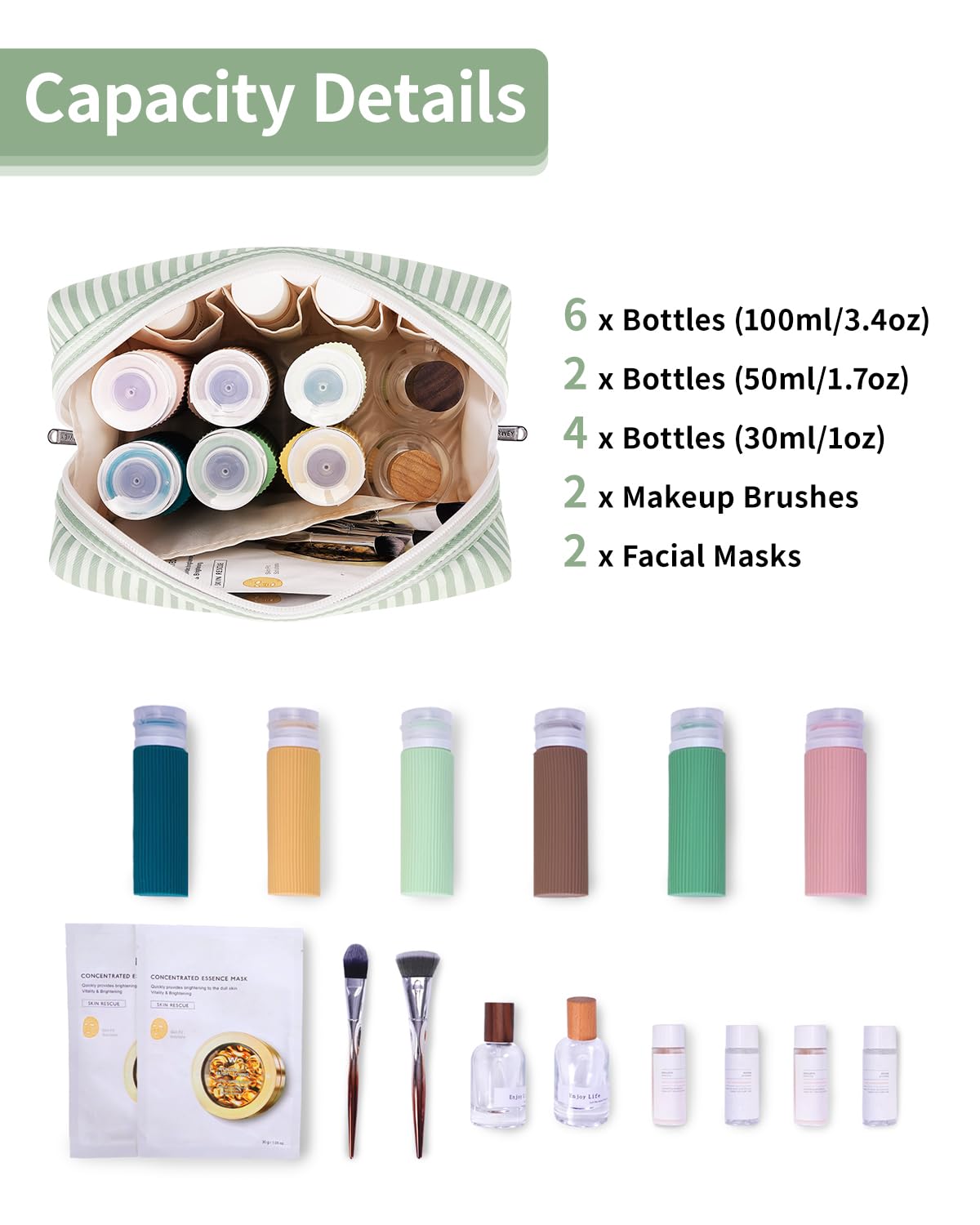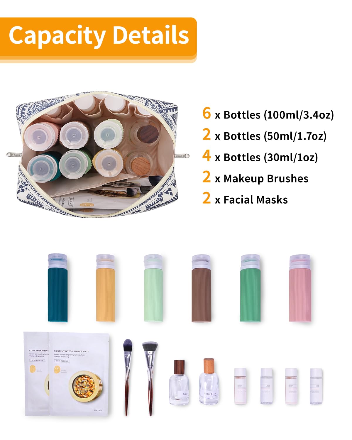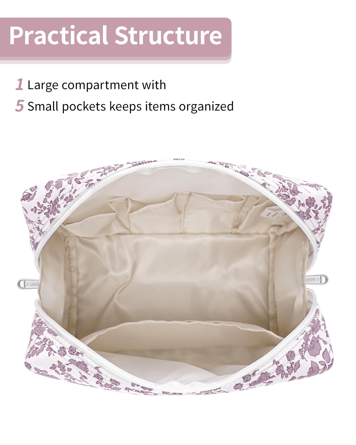 - WELL-ORGANIZED COMPARTMENTS. Practical main compartment with 5 inner small pockets could neatly organize your makeup. Main compartment could easily hold travel-size toiletries or skin-care products. It could fit 3 brushes, eyeliners, foundation, concealer, lipsticks, blushes, powder, eyeshadow pallet, mascara, lash curler, sponges, sunscreen, 0.08kg lotion, cream, facial cleanser and toothpaste