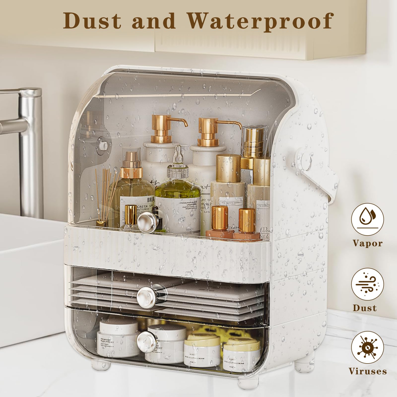 Skincare organiser with flip lid design, easy to open and reach, protects your cosmetics from water and dust, keep it neat and tidy.