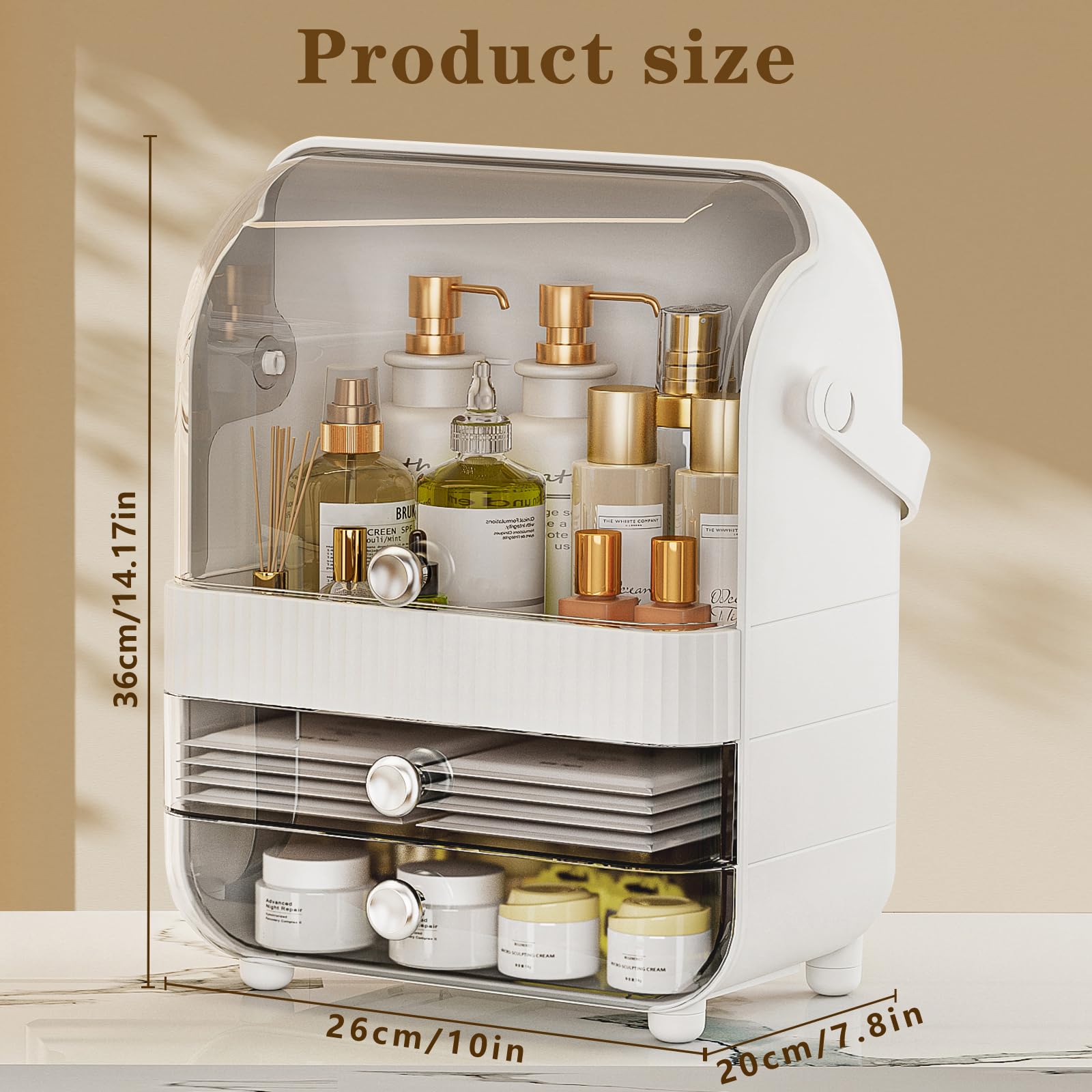 - Practical Large Capacity— Makeup Organiser dimensions: 14.1 x 10.2 x 7 in. This cosmetics organiser features one extra-large storage compartment with a flip-top lid and 2 large drawers, offering ample storage space. It can hold various items such as lotions, creams, face masks, lipsticks, eyeshadows, perfumes, makeup brushes, and more.