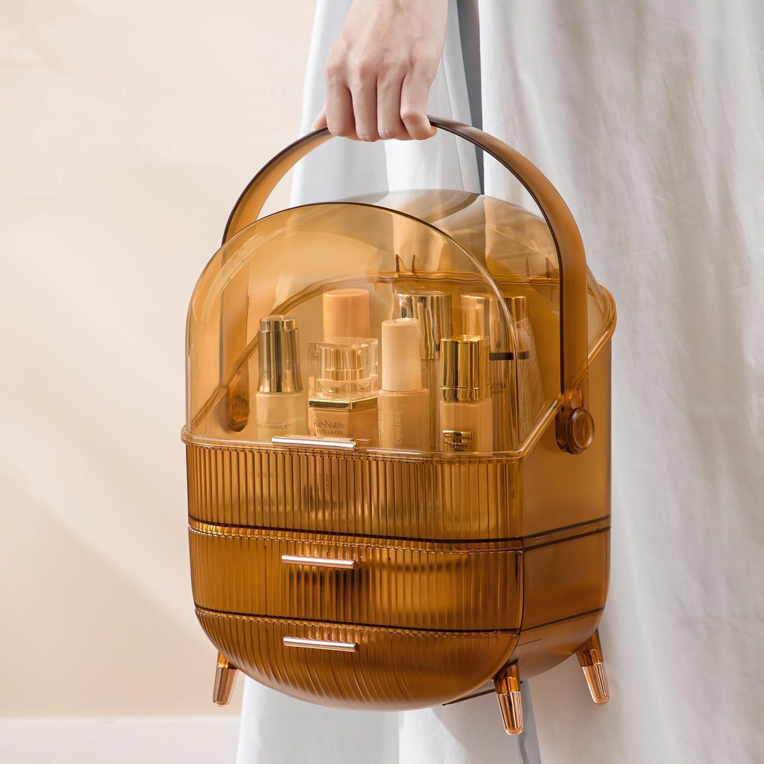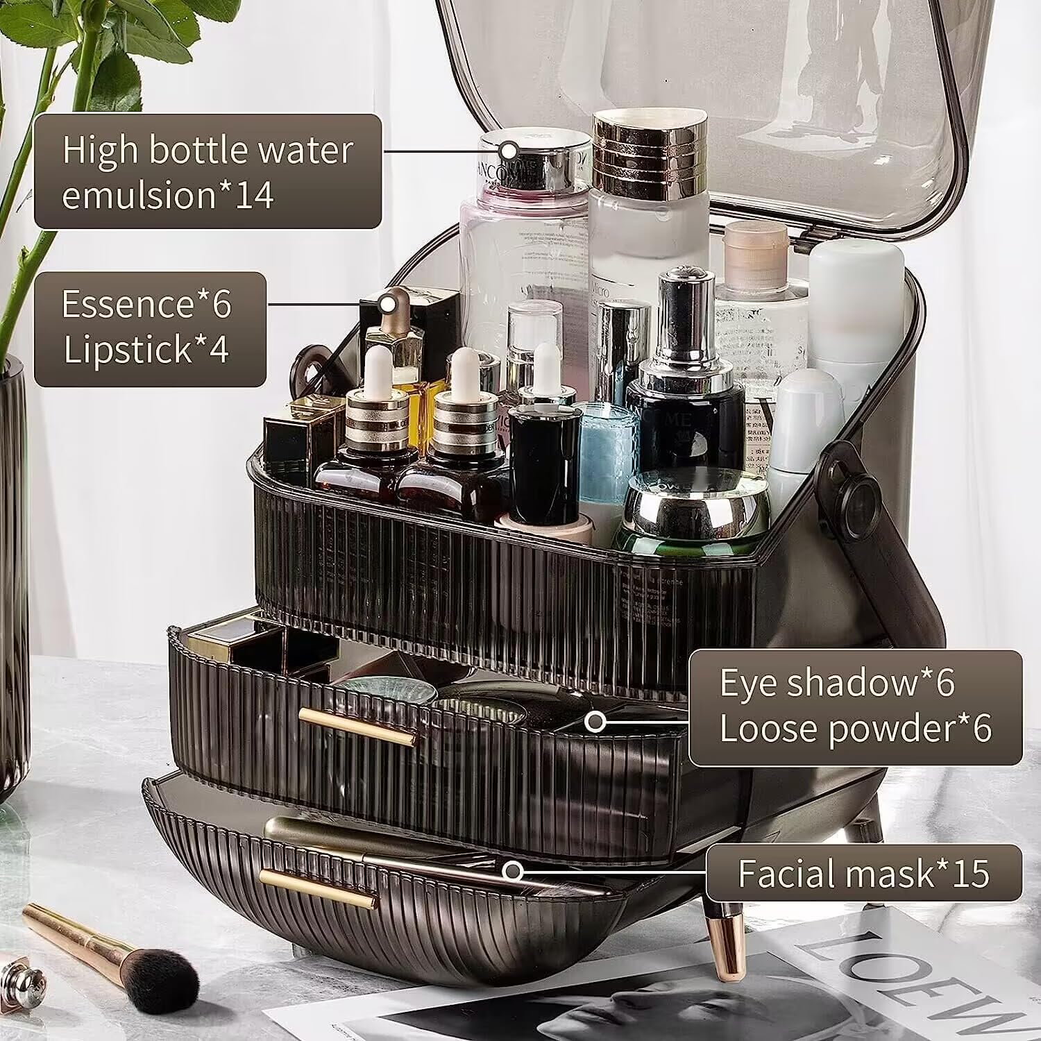 - 【Dustproof, Waterproof and Portable】The crystal-like transparent lid keeps your cosmetics away from dust and water, avoids dust and water stains, and is easy to clean. Skin care organizer is suitable for the dressing table or countertop in the bathroom, bedroom, or dressing room, equipped with a hand strap, which can easily move your cosmetic space, and is also convenient to carry when traveling, especially suitable for car travel.