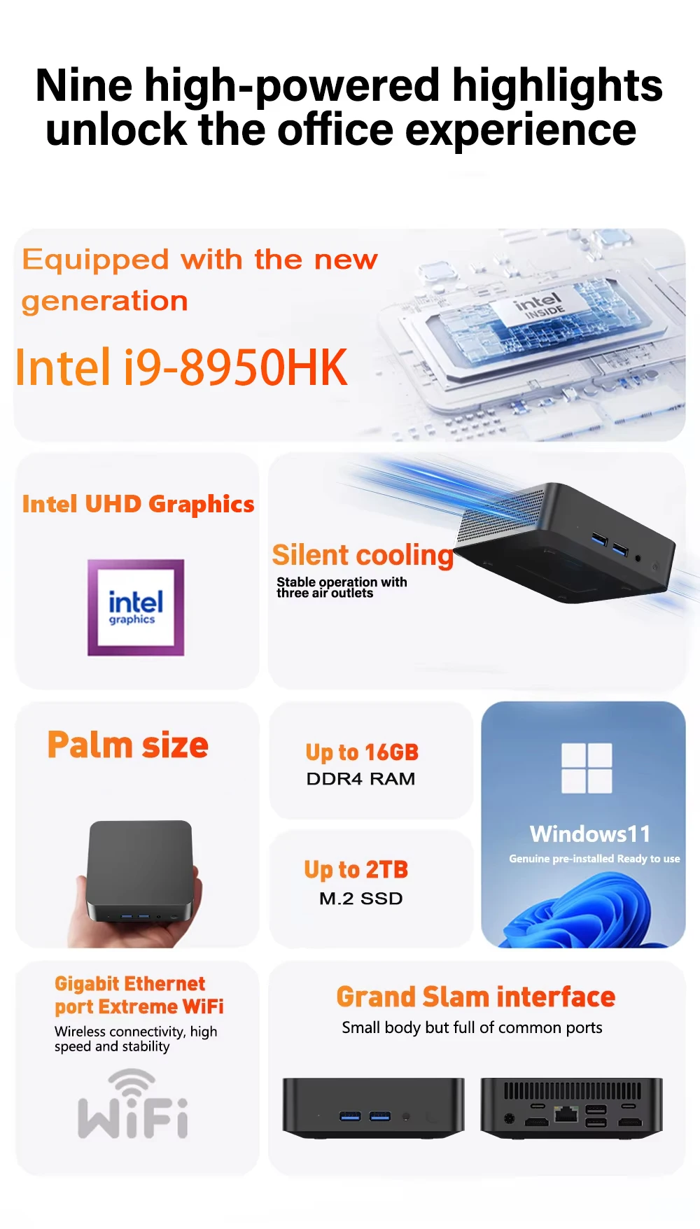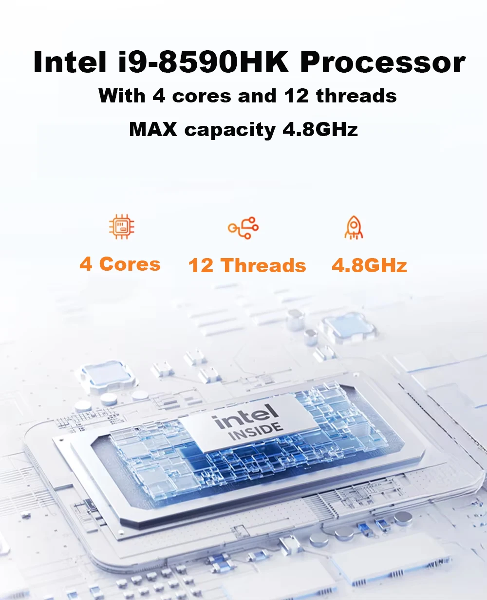 • Intel I9-8950HK Processor : Mini PC comes with an Intel I9-8950HK processor, which provides high performance and efficient power consumption.